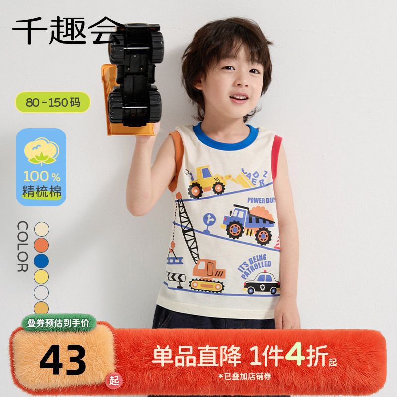 千趣会童装儿童夏装无袖T恤工程车印花潮酷男童运动纯棉透气背心