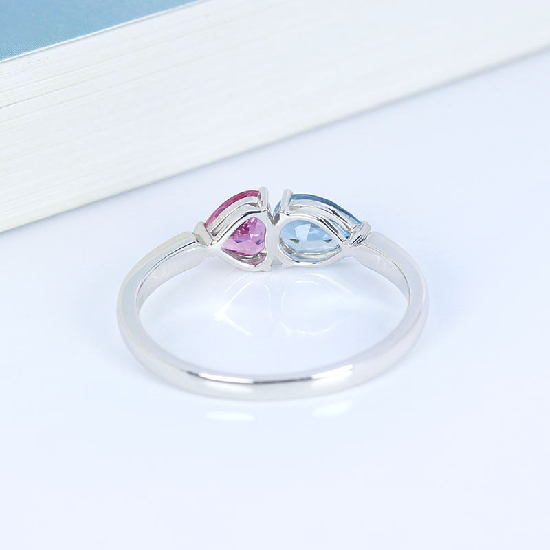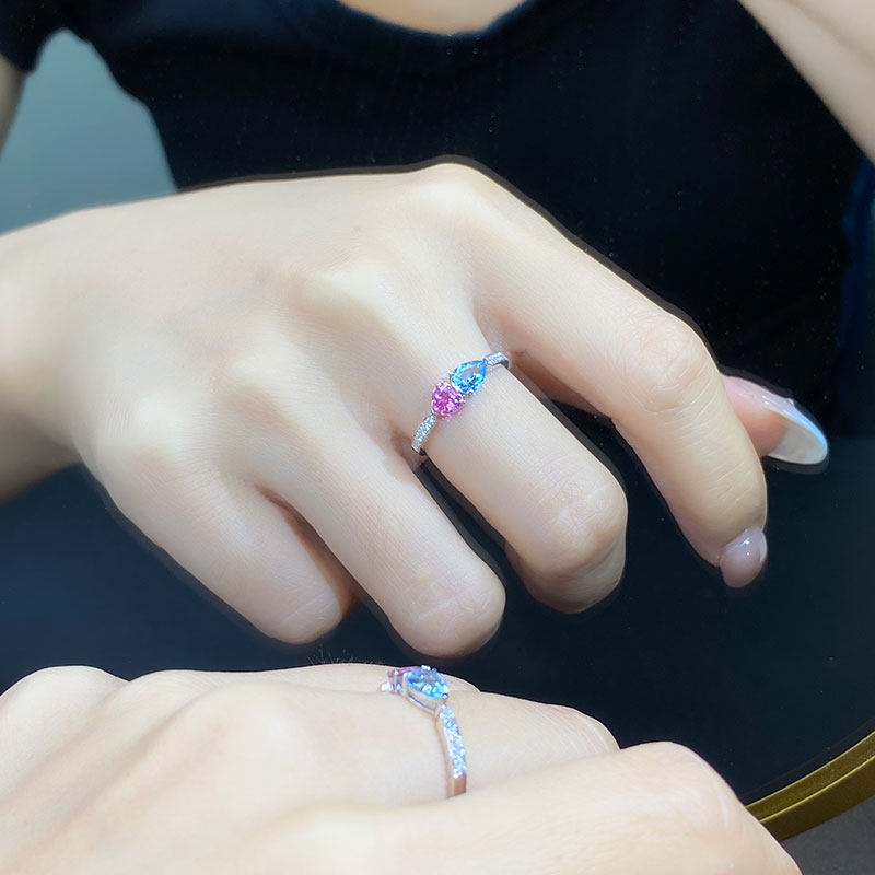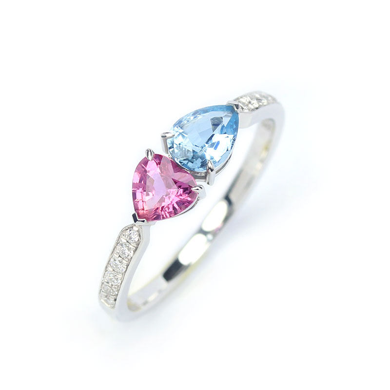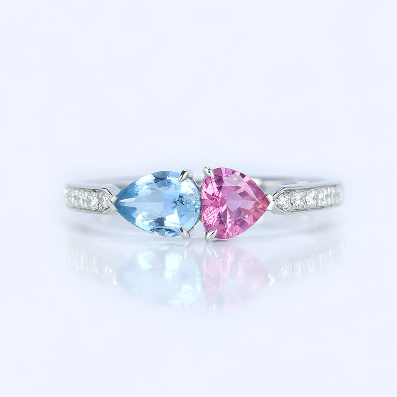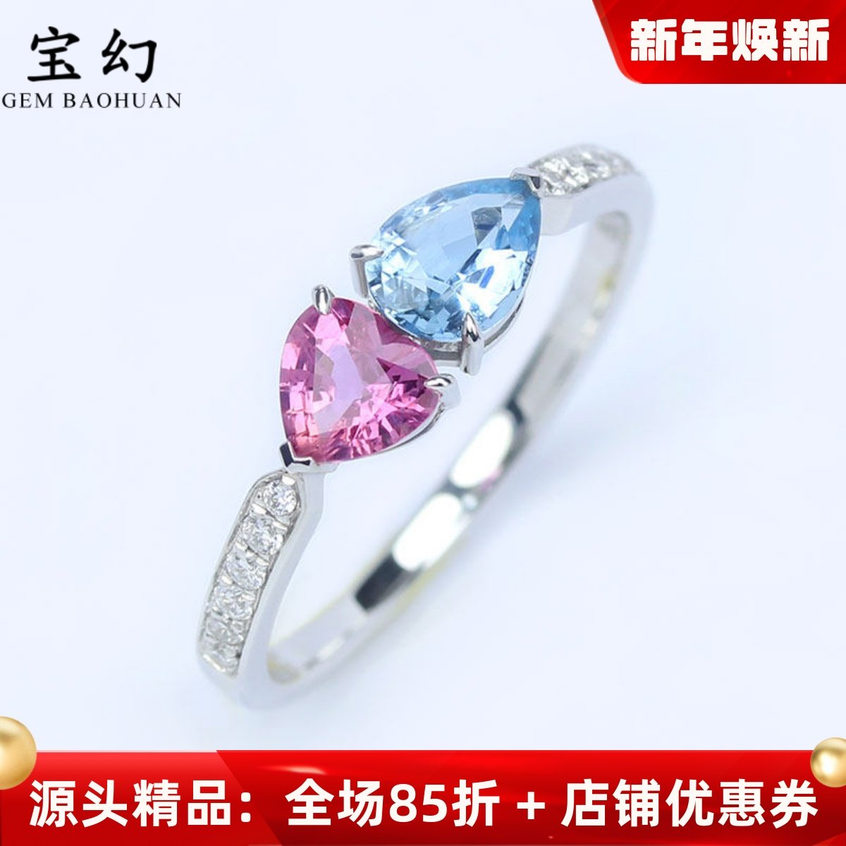 海洋之心18K白金天然粉色蓝宝石心形戒指 水滴形海蓝宝钻石正品女