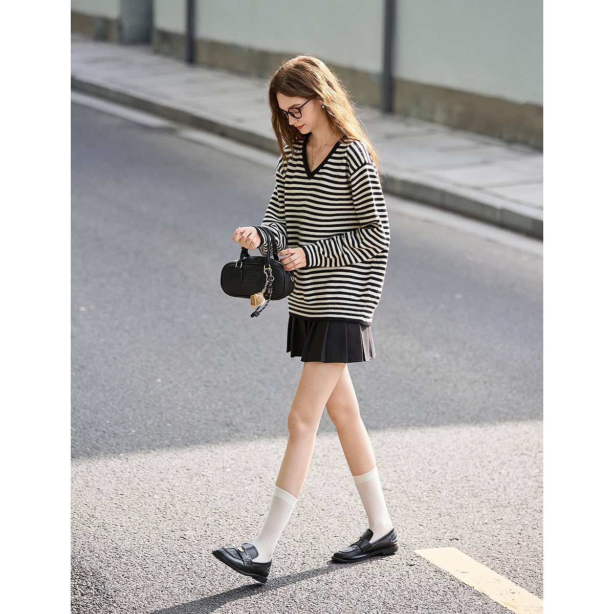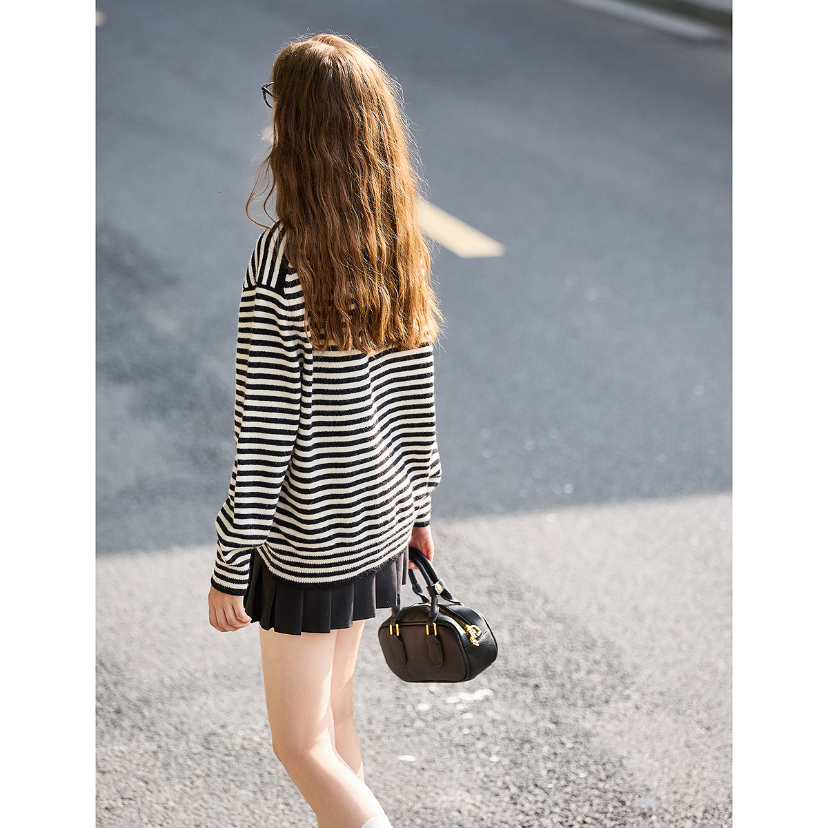 yoe秋冬新款毛衣女撞色v领条纹宽松秋季流行穿搭毛线衫TD
