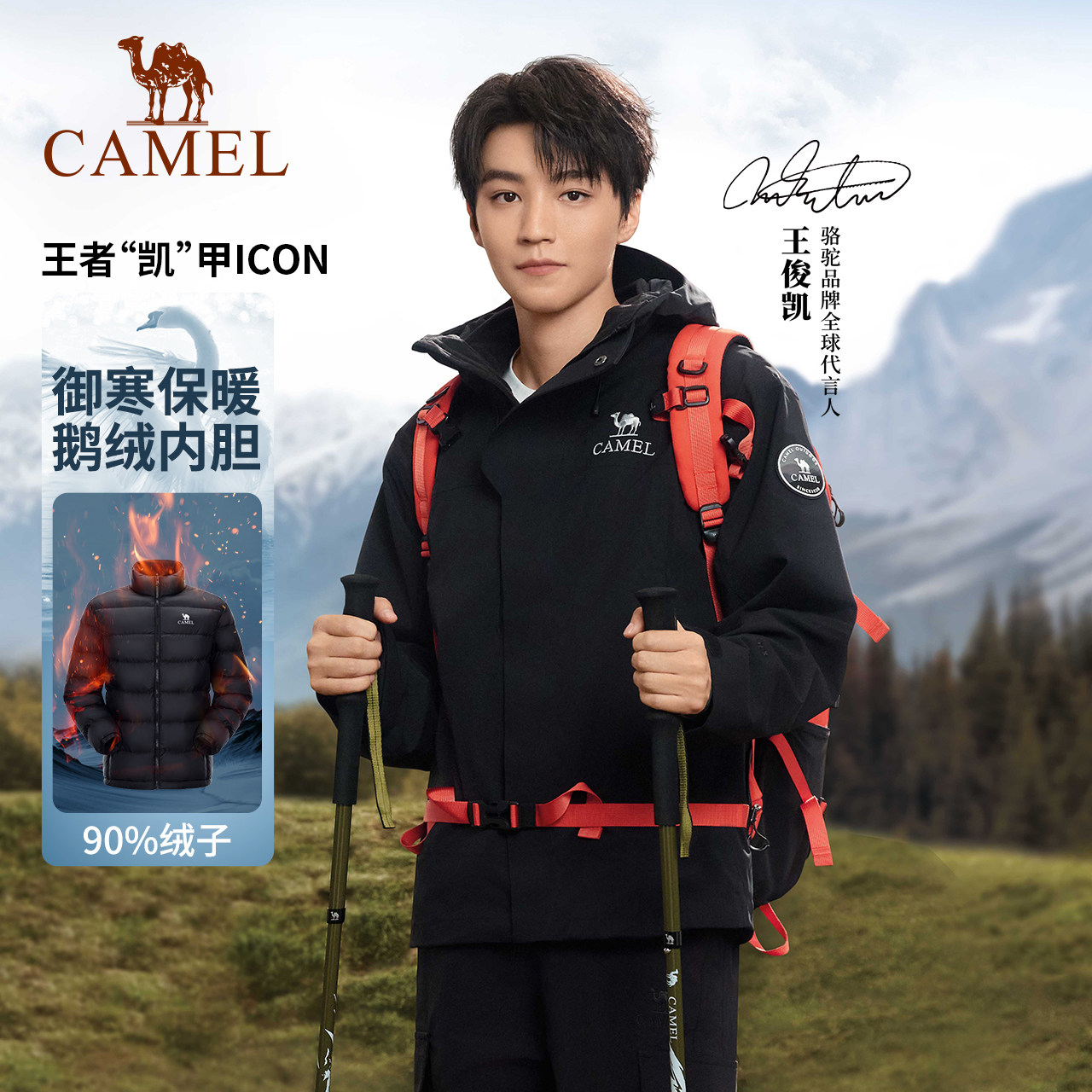 【冲锋衣鹅绒服】骆驼王者凯甲ICON三合一羽绒服女防水登山外套男