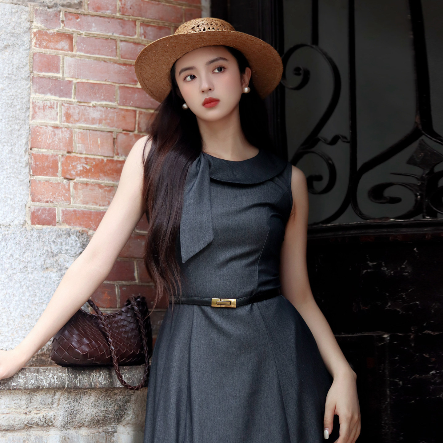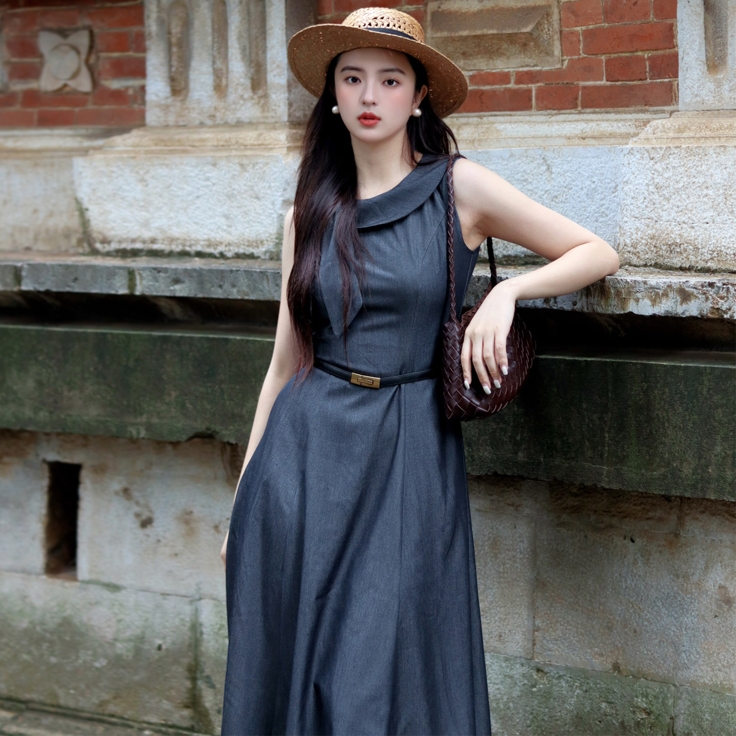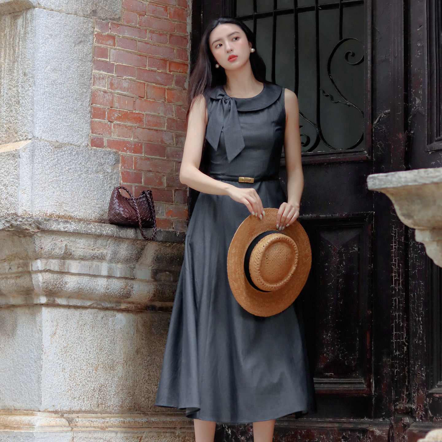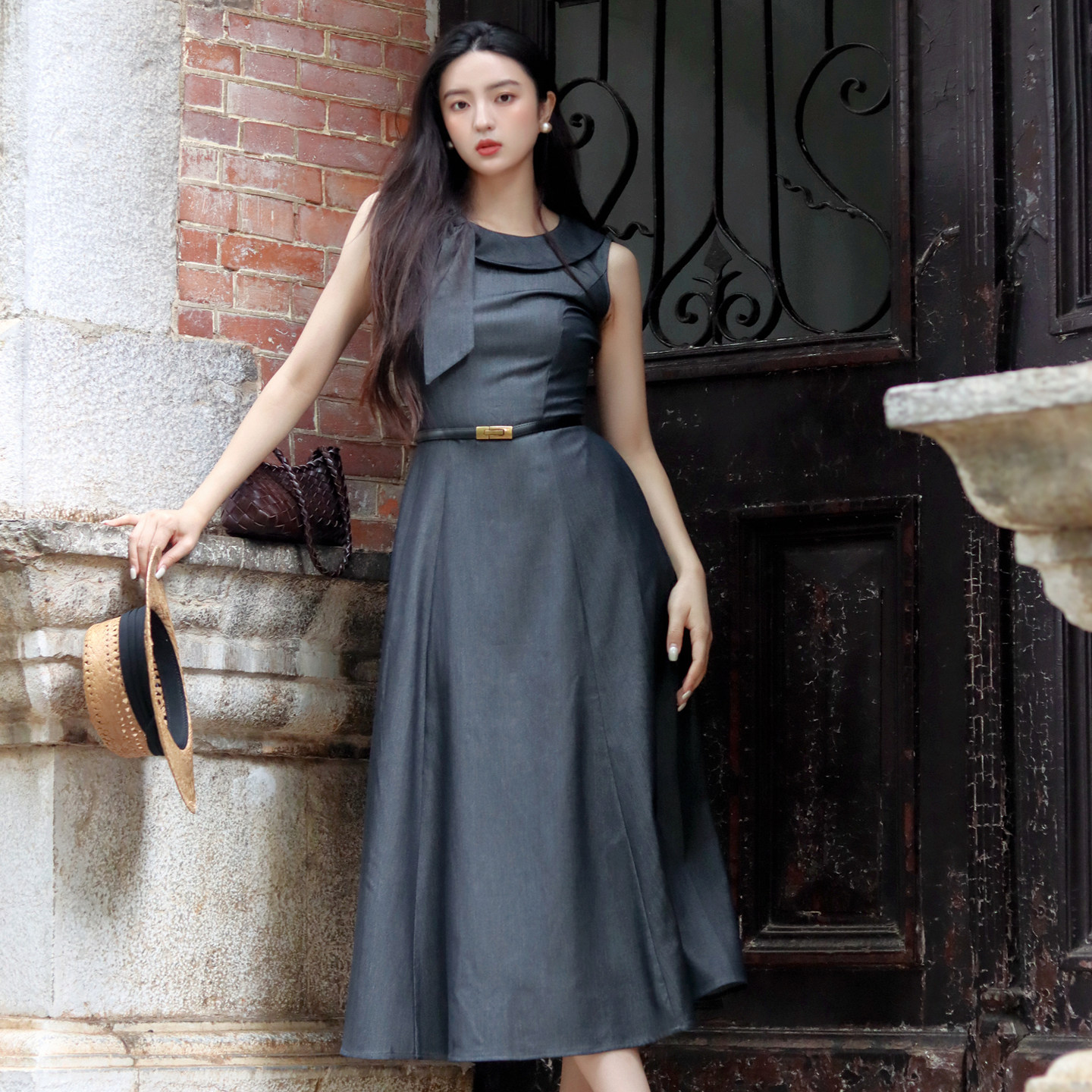 JUJU定制高级感法式复古无袖连衣裙新款收腰气质赫本风长裙女夏季