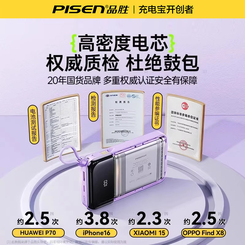 【充电宝3C认证】品胜20000毫安充电宝自带四线大容量超薄小巧便携政府补贴移动电源适用苹果17华为可上飞机
