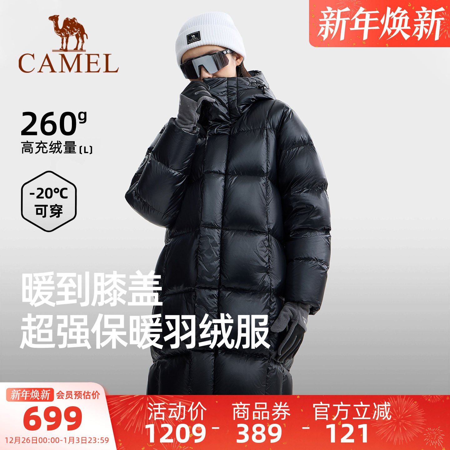 骆驼企鹅长款羽绒服女款冬季新款高充绒量防风保暖黑色羽绒外套男