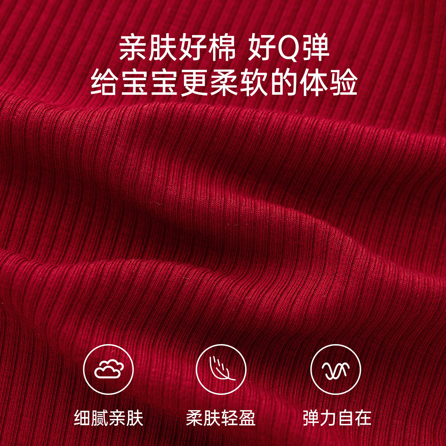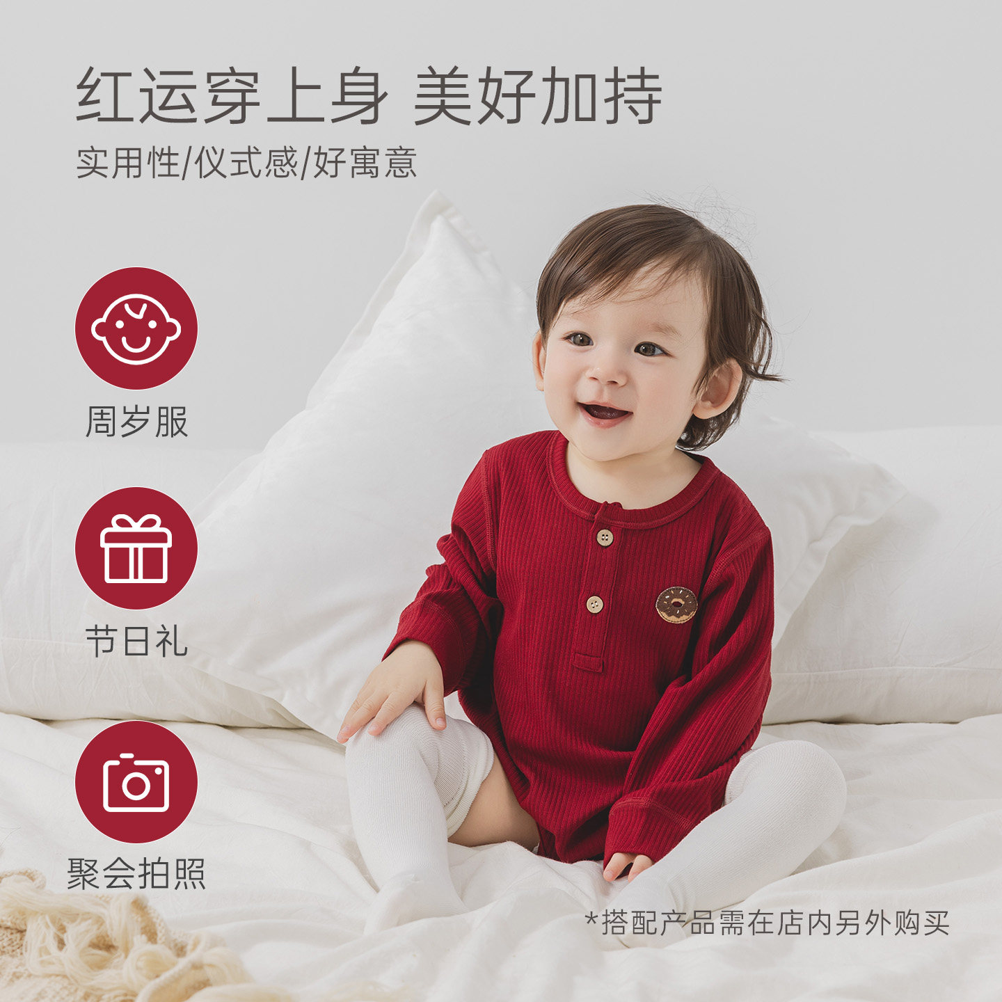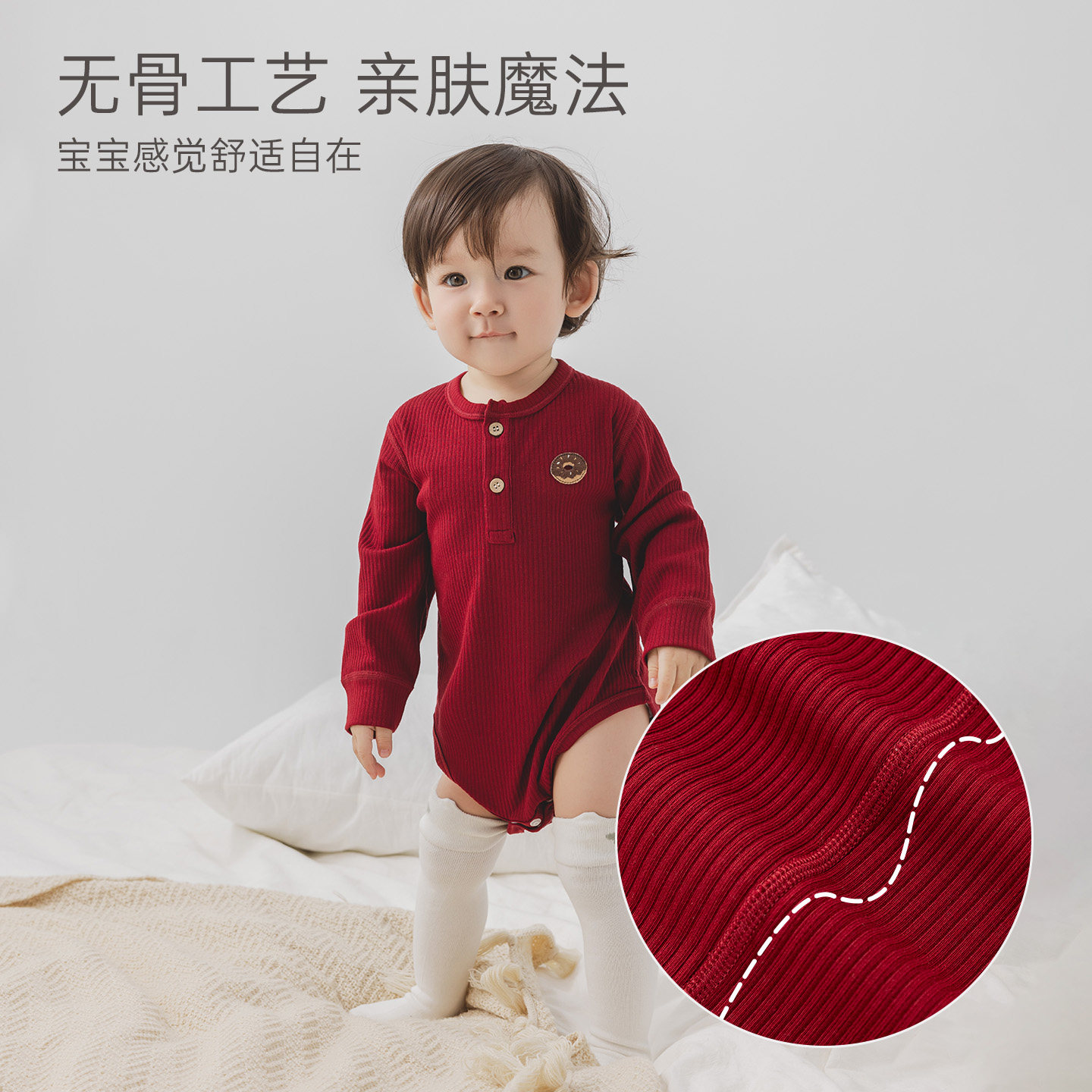 木生棉宝宝弹力连体衣秋冬婴儿三角哈衣红色喜庆周岁新年服包屁衣