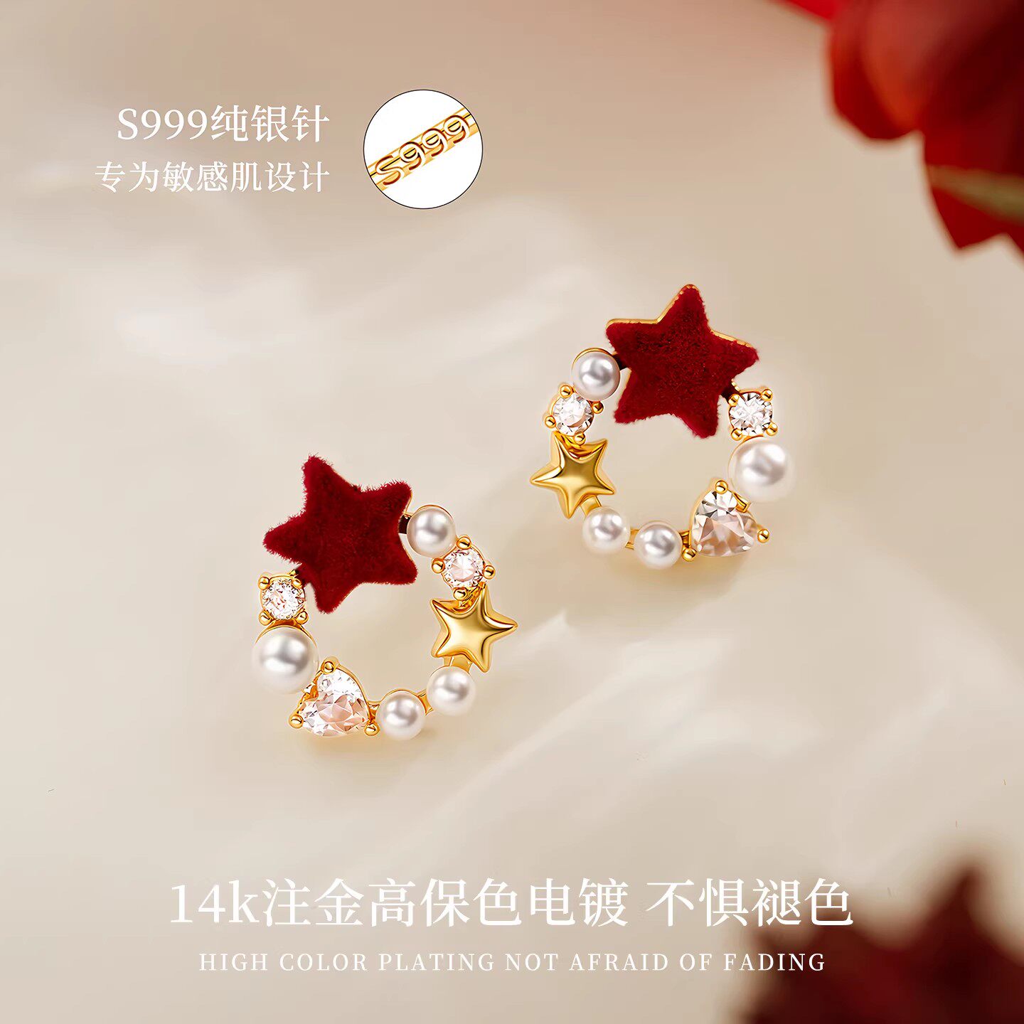 S999纯银针星星珍珠耳钉女轻奢耳环2026新款爆款本命年耳饰新年