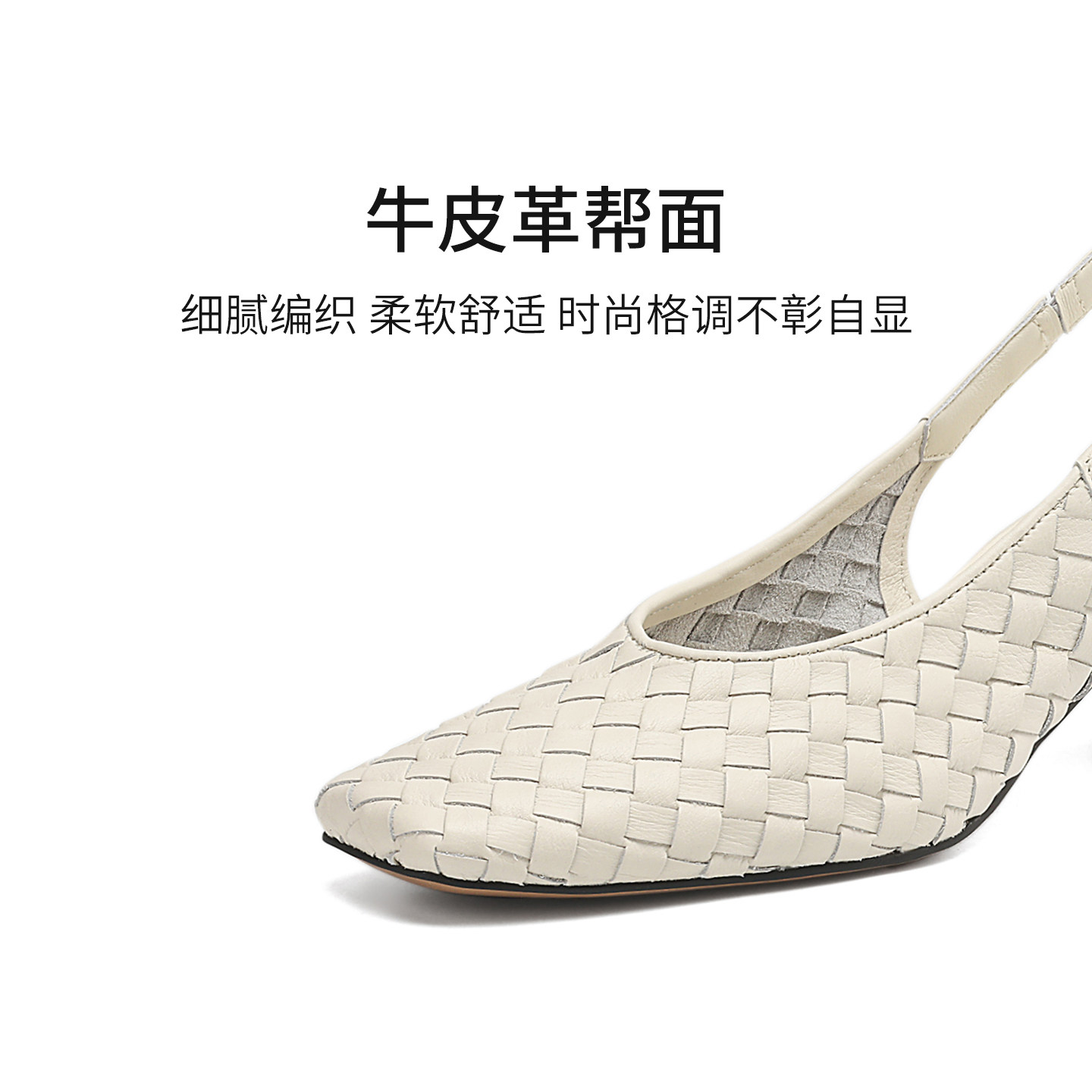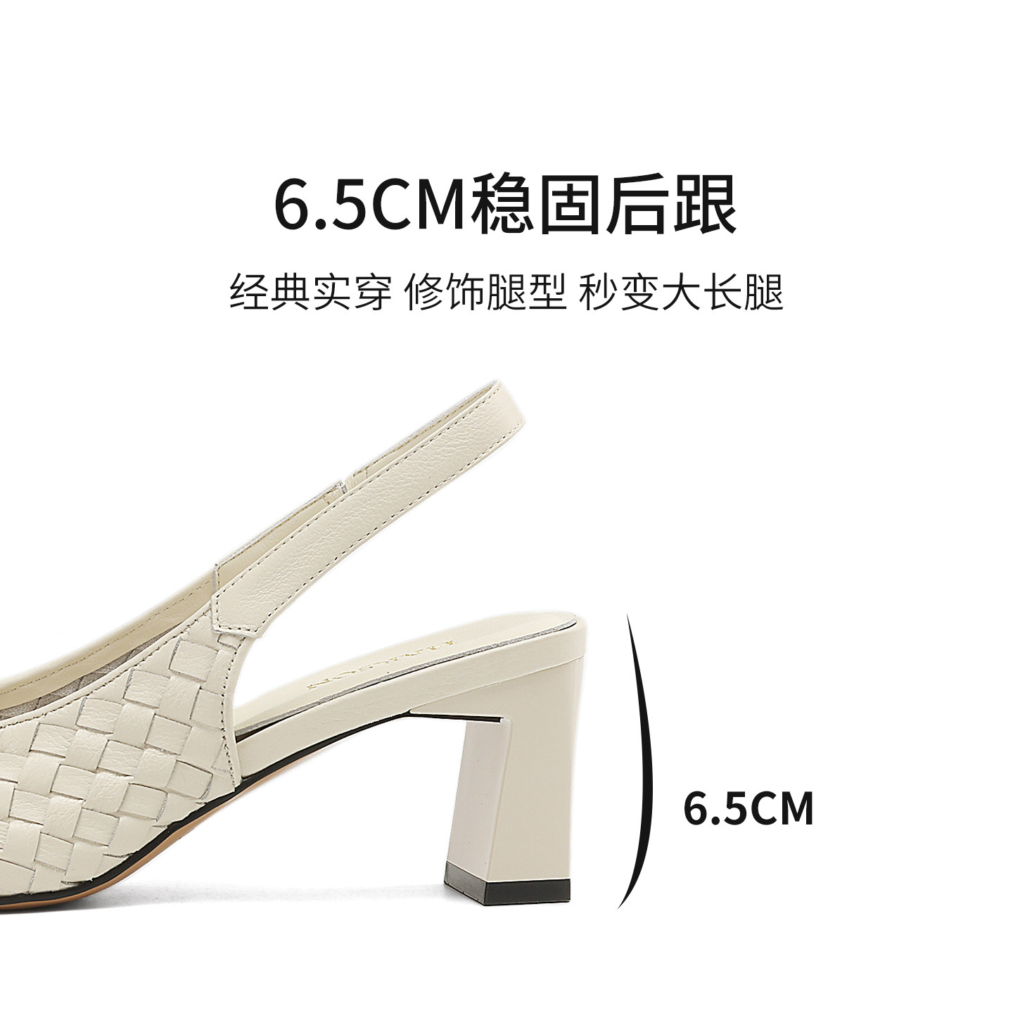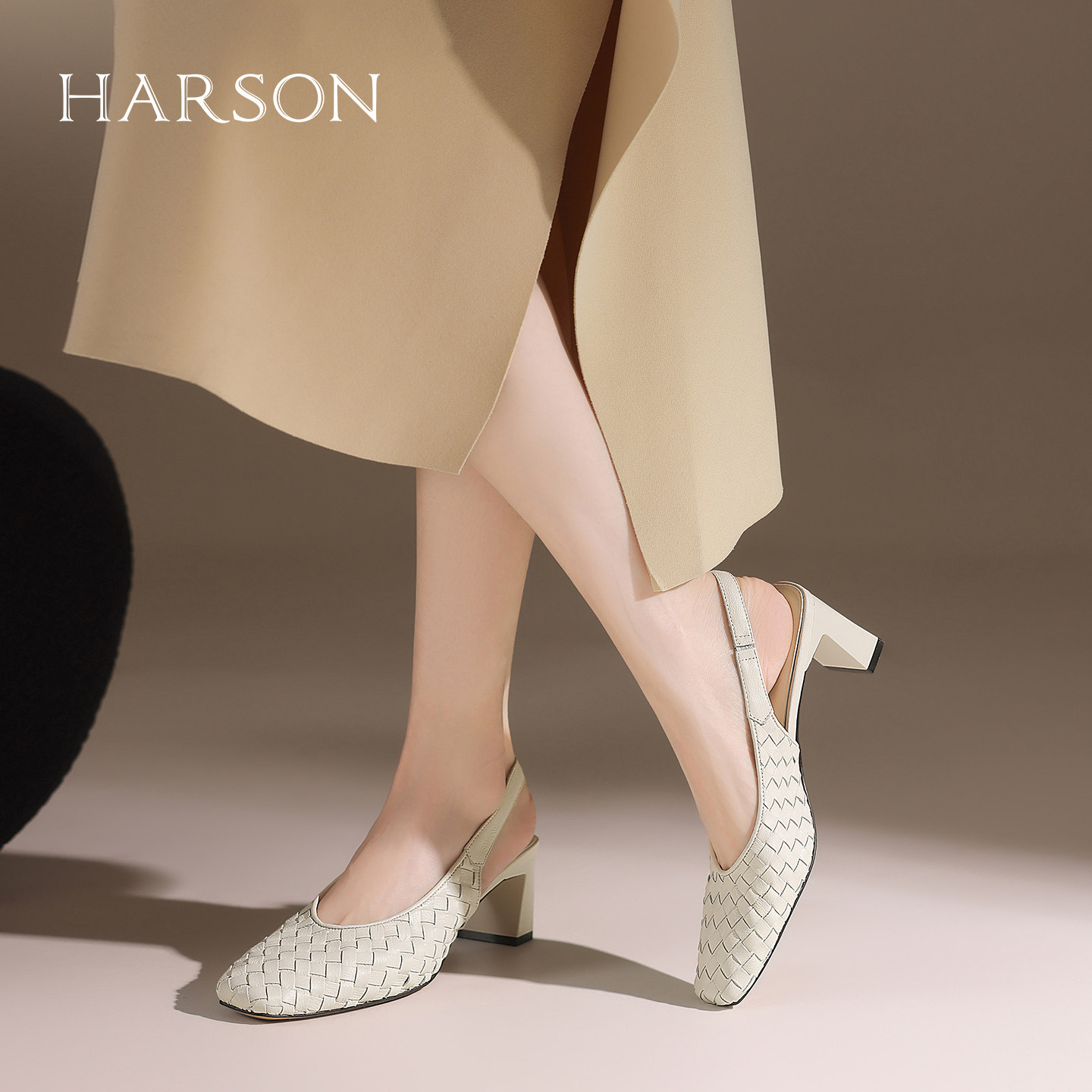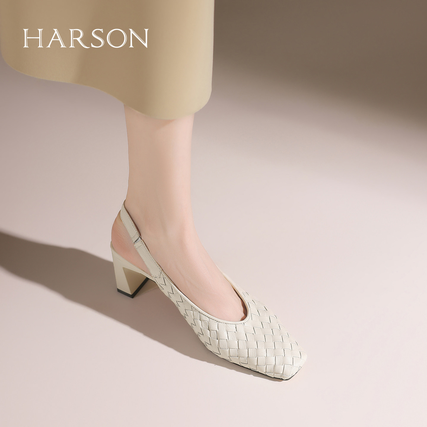 哈森编织纹理方头粗跟后空凉鞋夏法式百搭套脚时装凉鞋HWM250151
