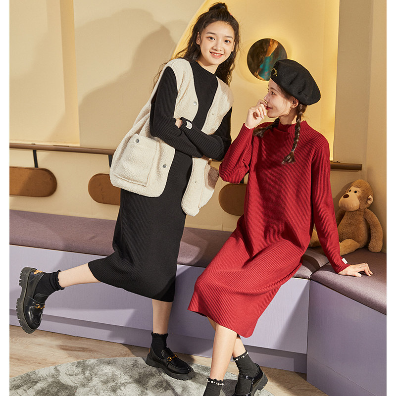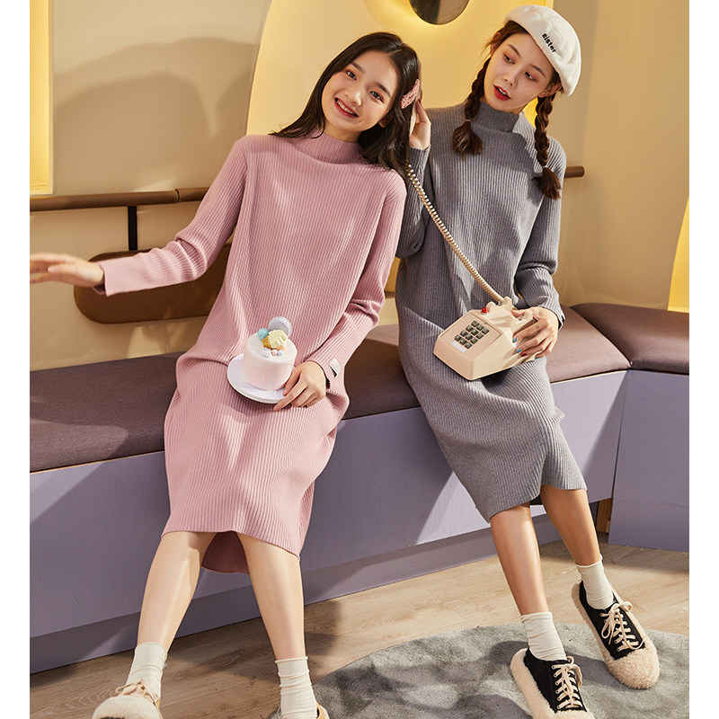 唐狮纯色打底裙秋冬女中长裙套头连衣裙半高领高腰a字裙休闲百搭