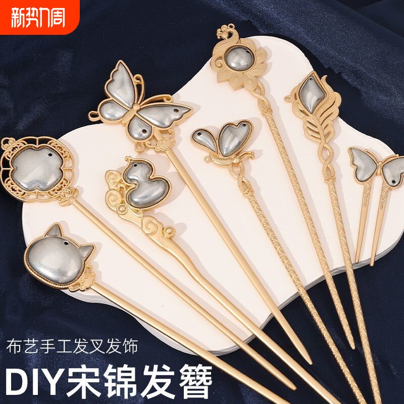 手工宋锦蓝染刺绣包布发簪底托新中式搭配旗袍汉服复古风发饰配件