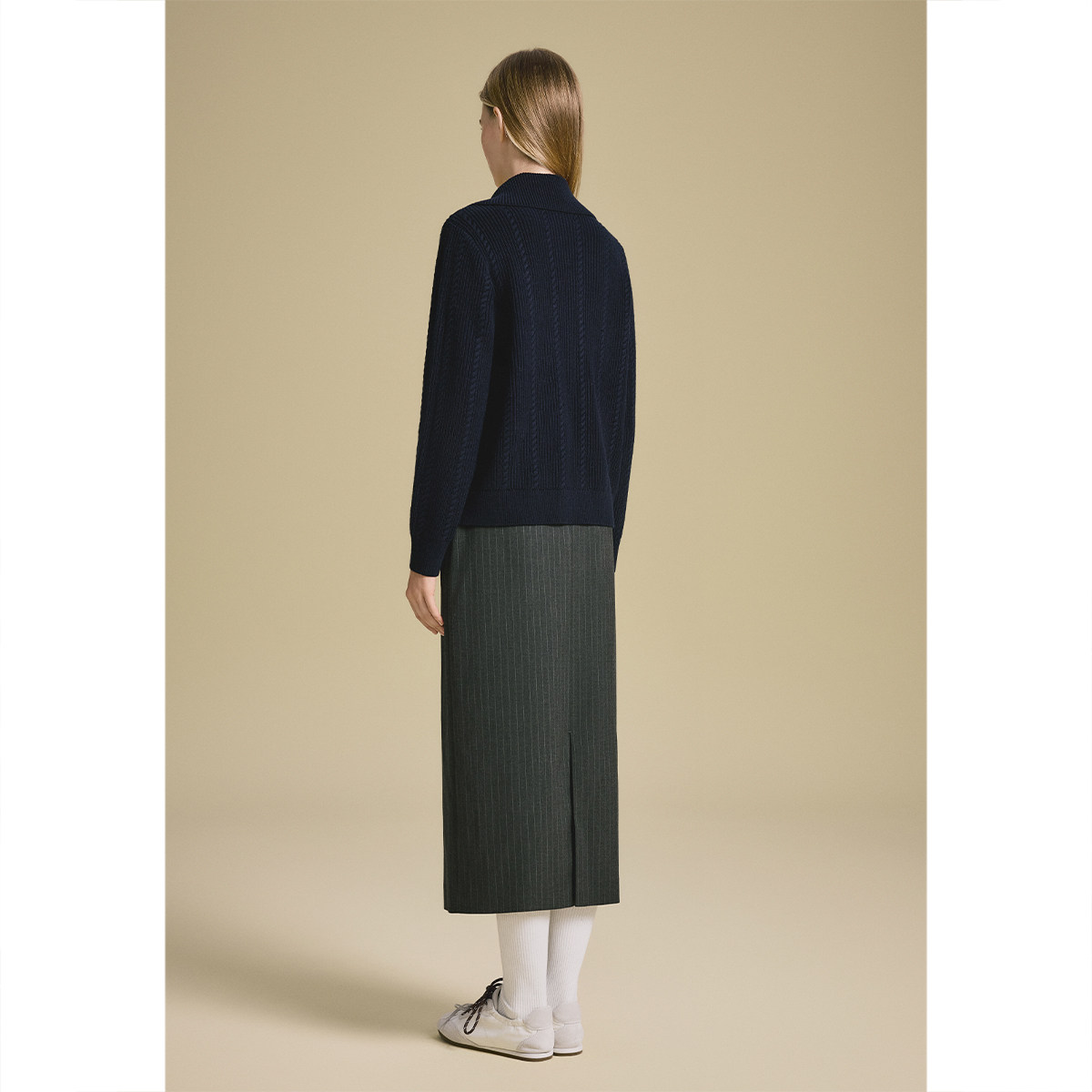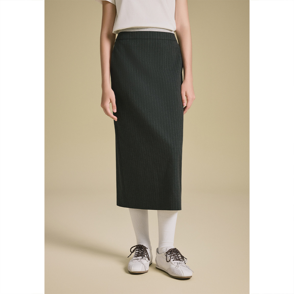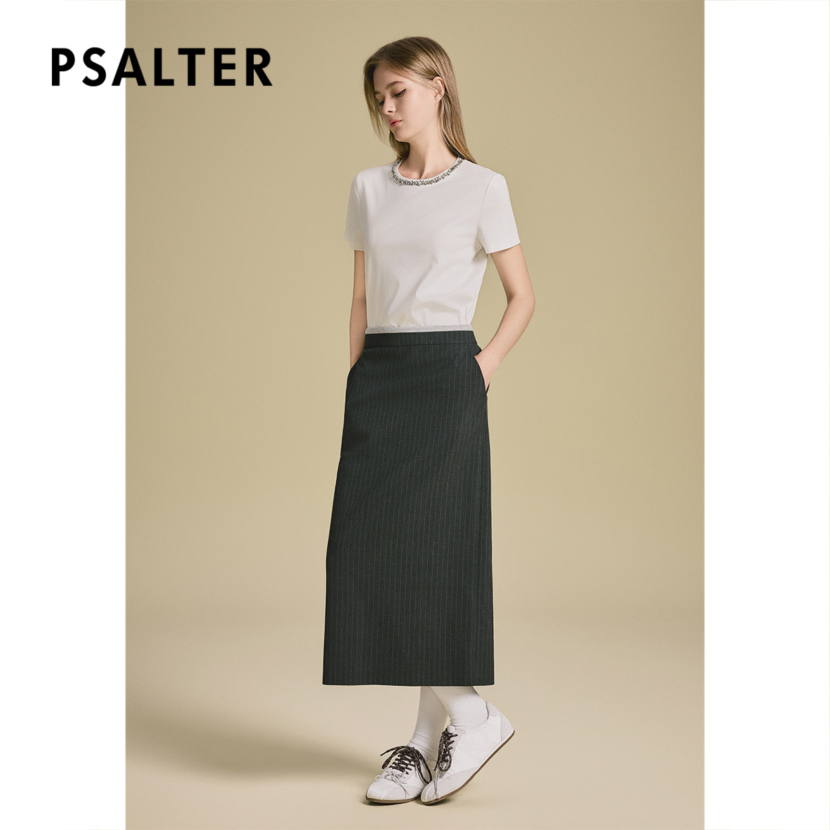 诗篇专选智性竖条纹后开叉直筒中长裙2025秋款