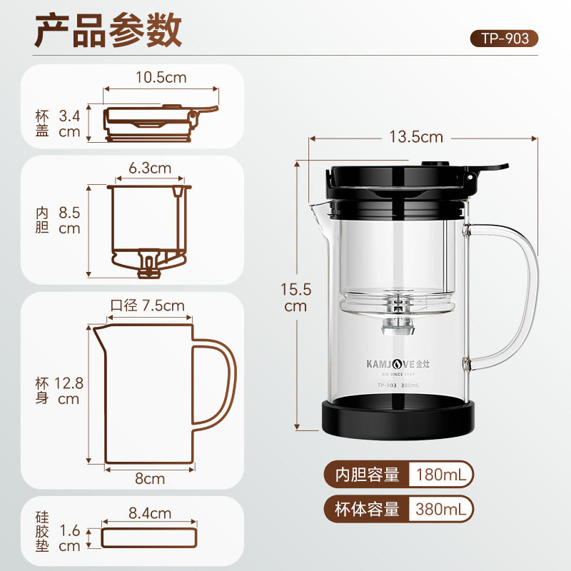 金灶TP-903玻璃内胆飘逸杯家用单人泡茶壶茶水分离一键滤茶飘逸壶