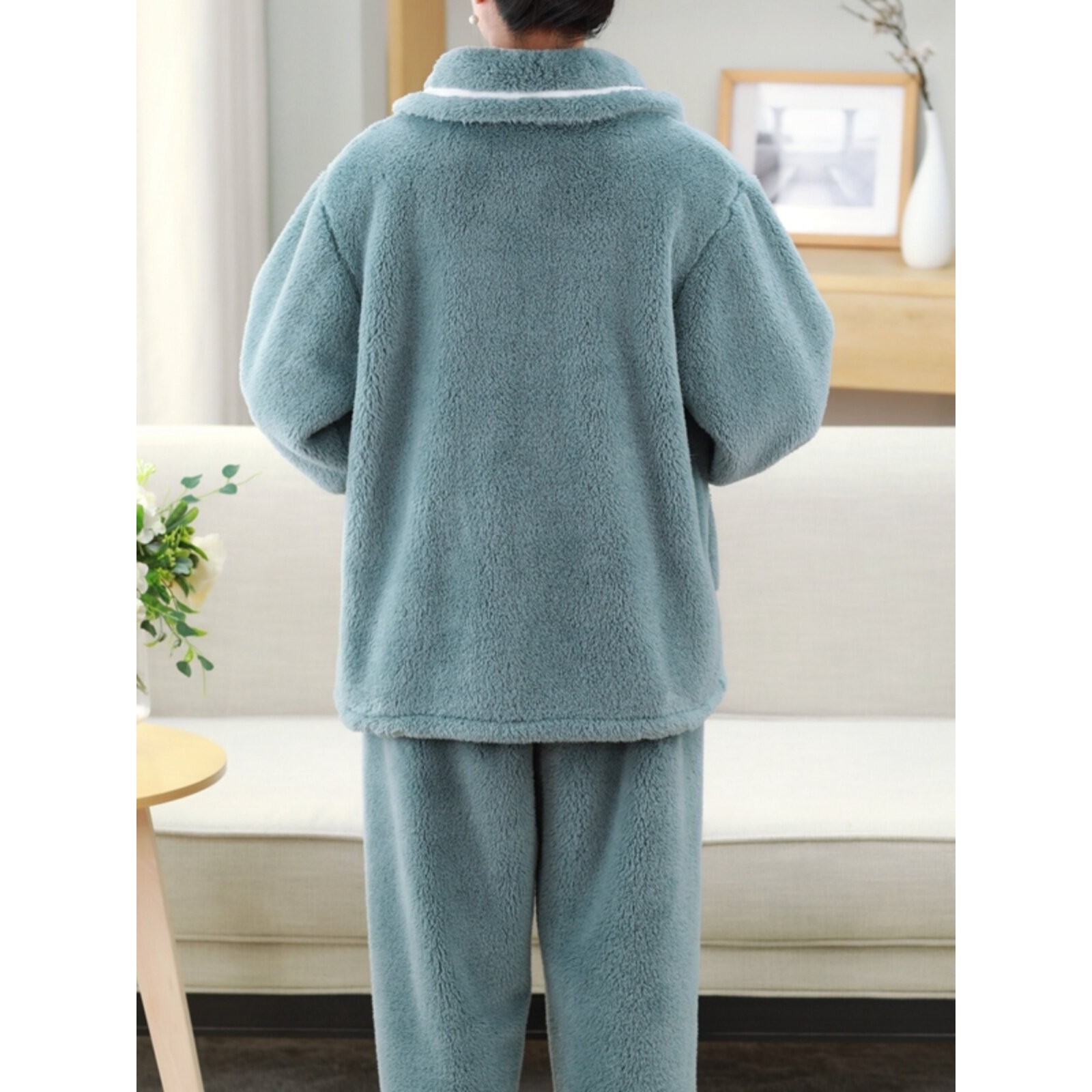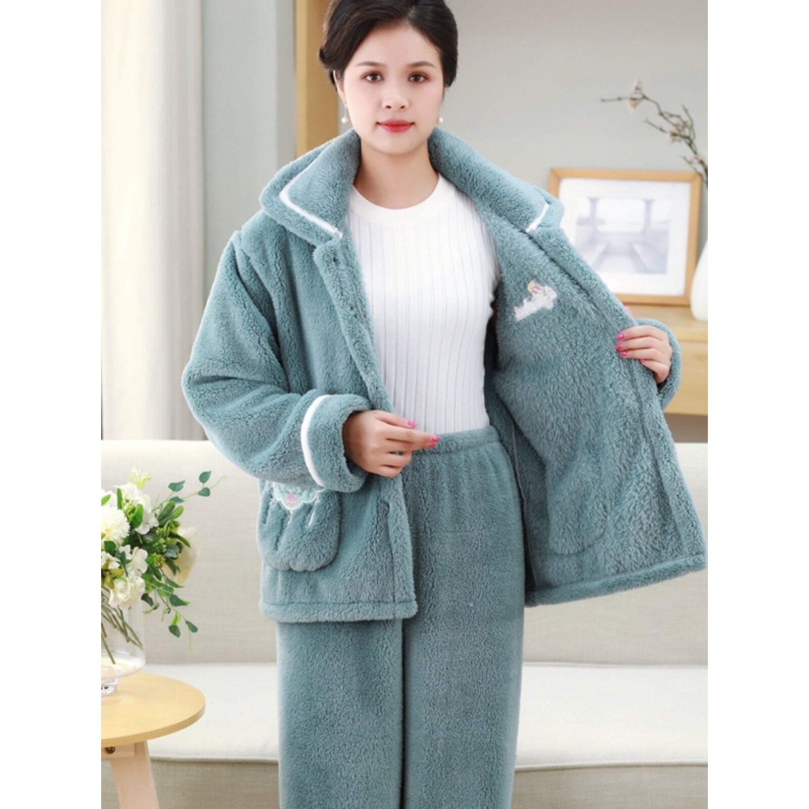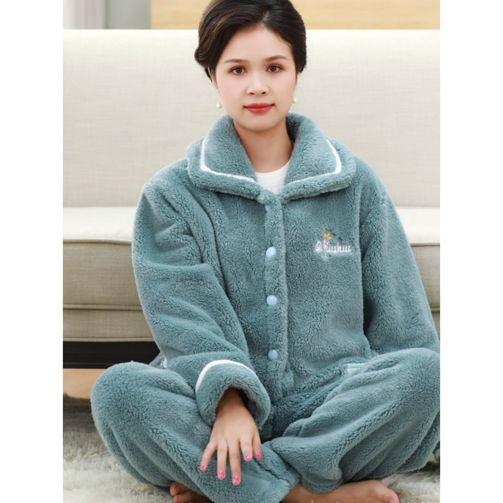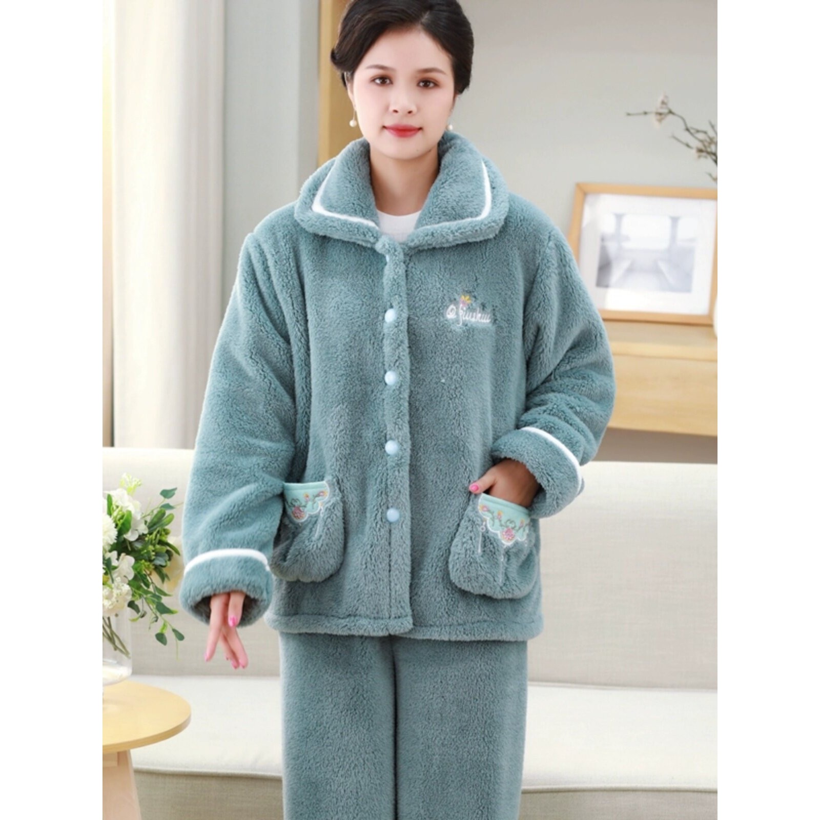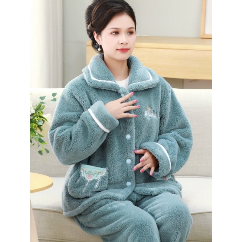 红豆珊瑚绒妈妈睡衣女秋冬加厚加绒长袖法兰绒家居服毛绒套装大码