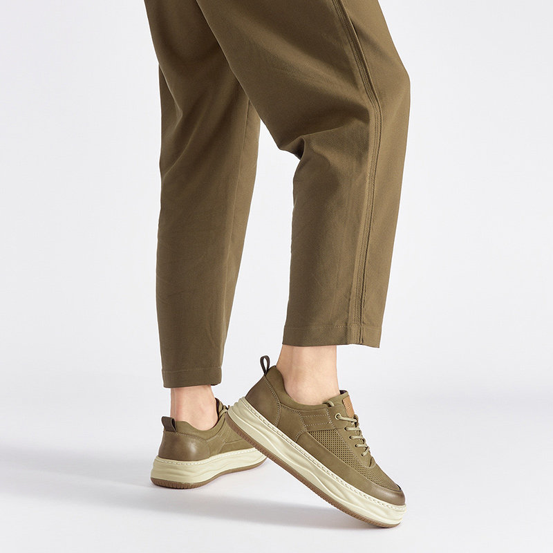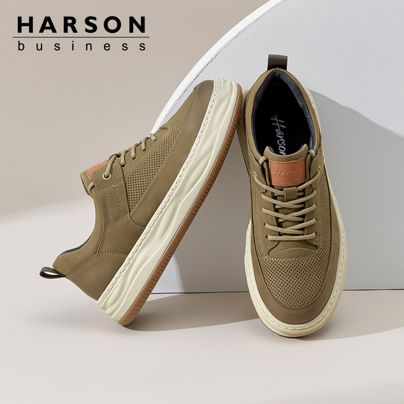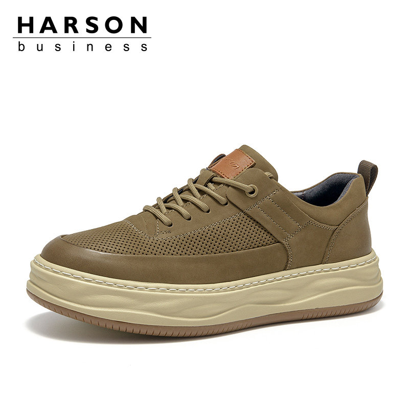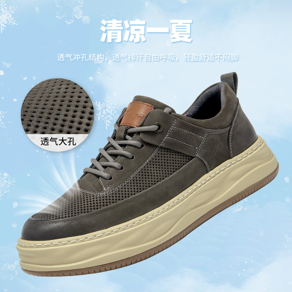 哈森鞋子男鞋夏透气镂空休闲皮鞋男士厚底真皮板鞋复古百搭休闲鞋