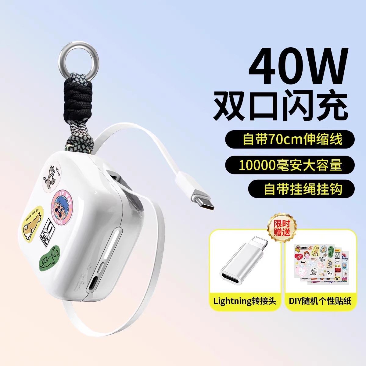 国家3C认证40W快充充电宝自带伸缩线长线迷你挂包可上飞机便携式户外挂钩抽拉移动电源10000毫安适用16苹果17