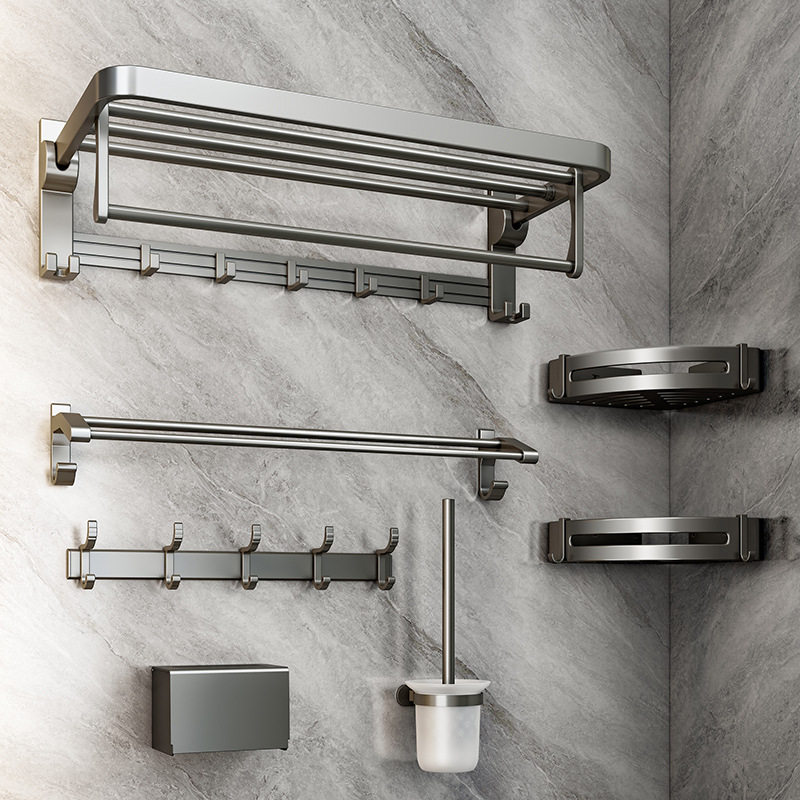 卫生间毛巾架置物架一体浴室免打孔厕所枪灰浴巾架太空铝卫浴双杆