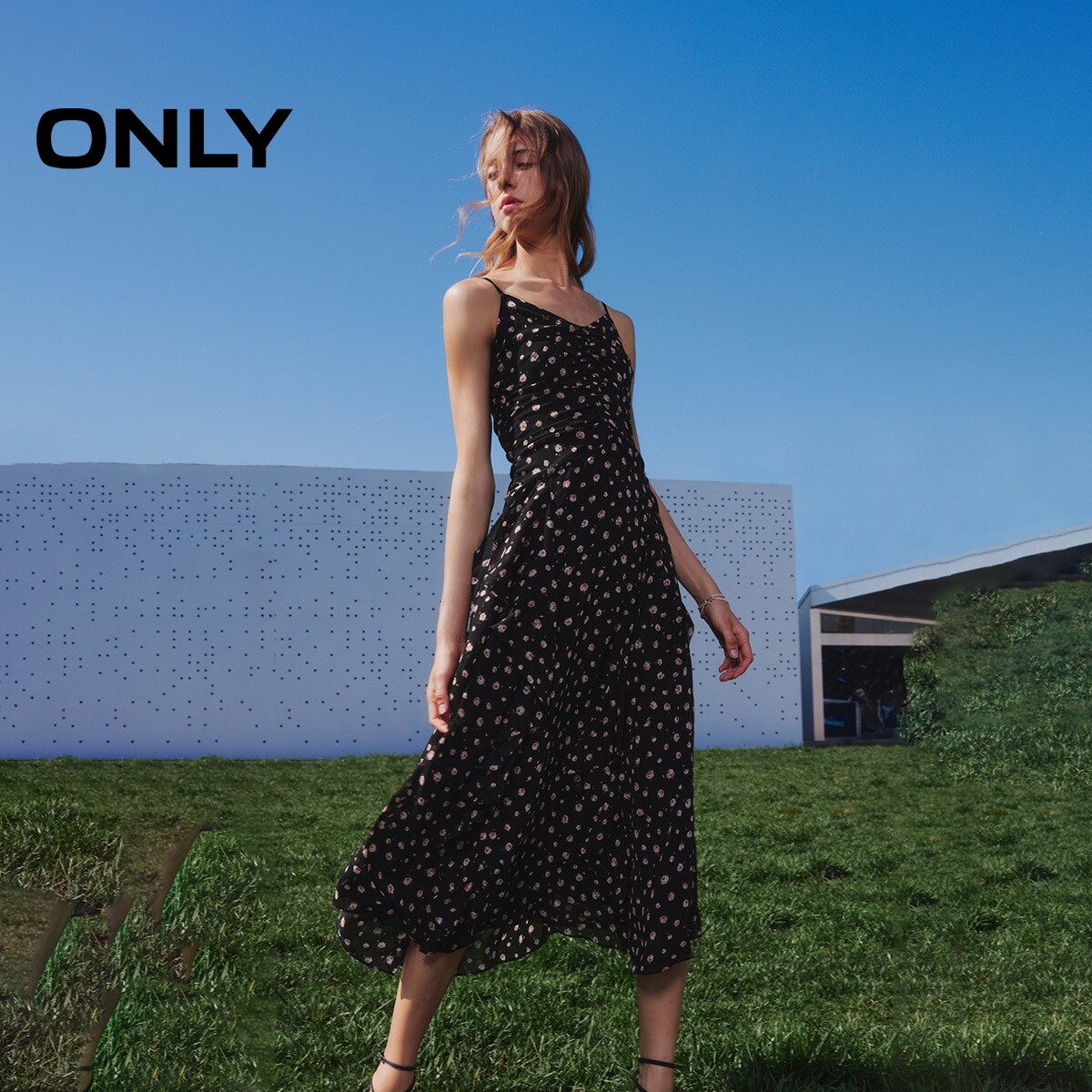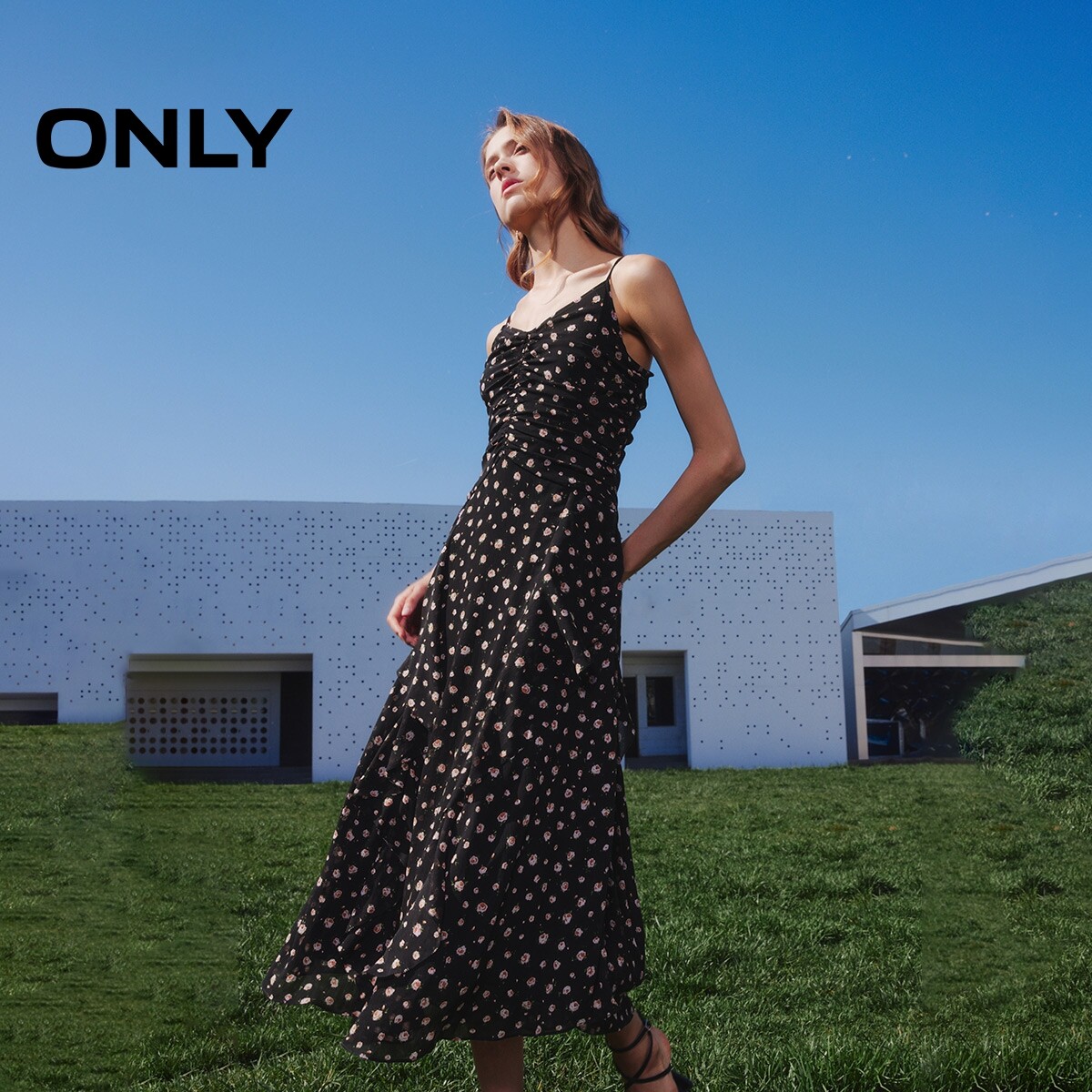【ONLY奥莱】春季新款时尚气质抽褶中长款碎花吊带连衣裙女