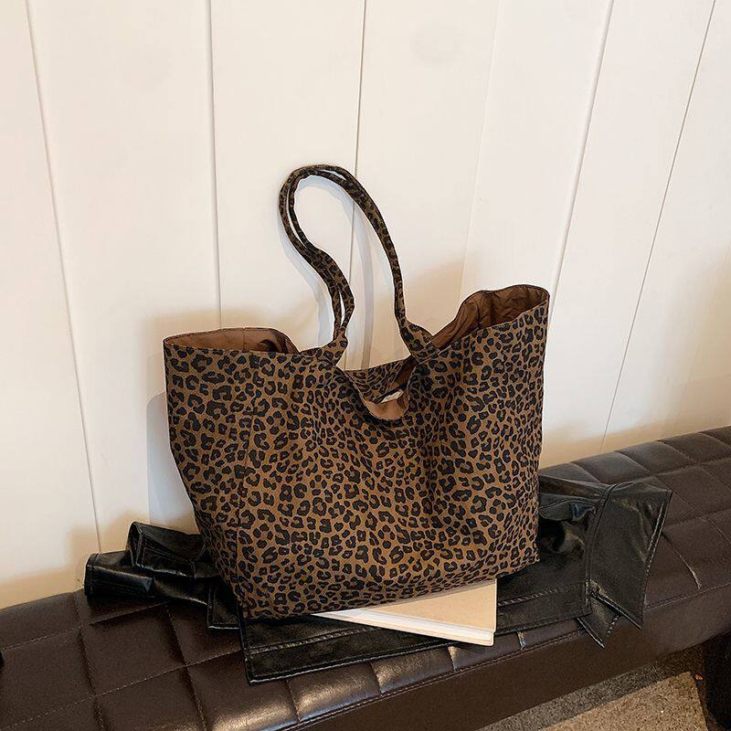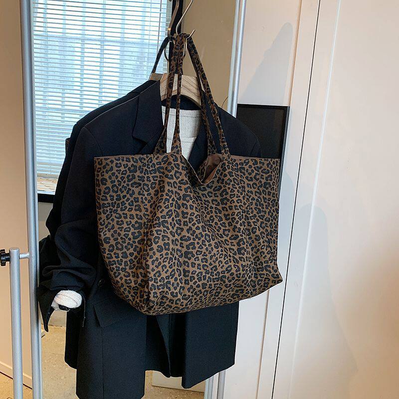 韩系小众豹纹帆布包女学生新款休闲慵懒风单肩包大容量通勤托特包