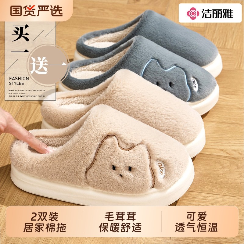 洁丽雅买一送一棉拖鞋女士冬季居家情侣一对保暖毛拖鞋男款冬厚底