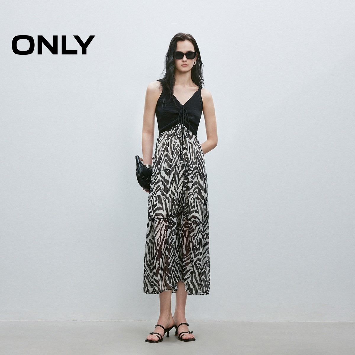 ONLY夏季拼接飘逸纱裙抽绳系带V领显瘦中长裙连衣裙女