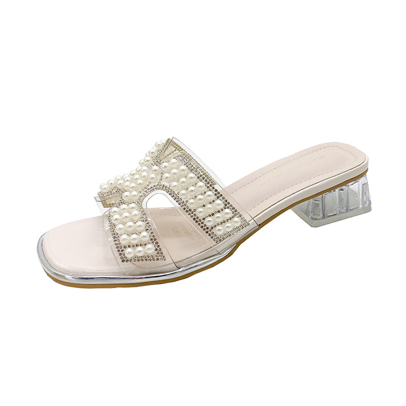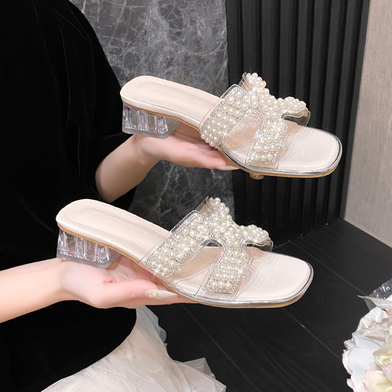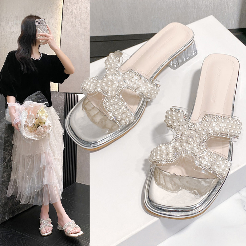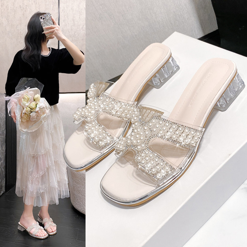 仙女风珍珠串珠凉鞋女夏外穿透明水晶粗跟中跟凉拖鞋露趾时装凉鞋