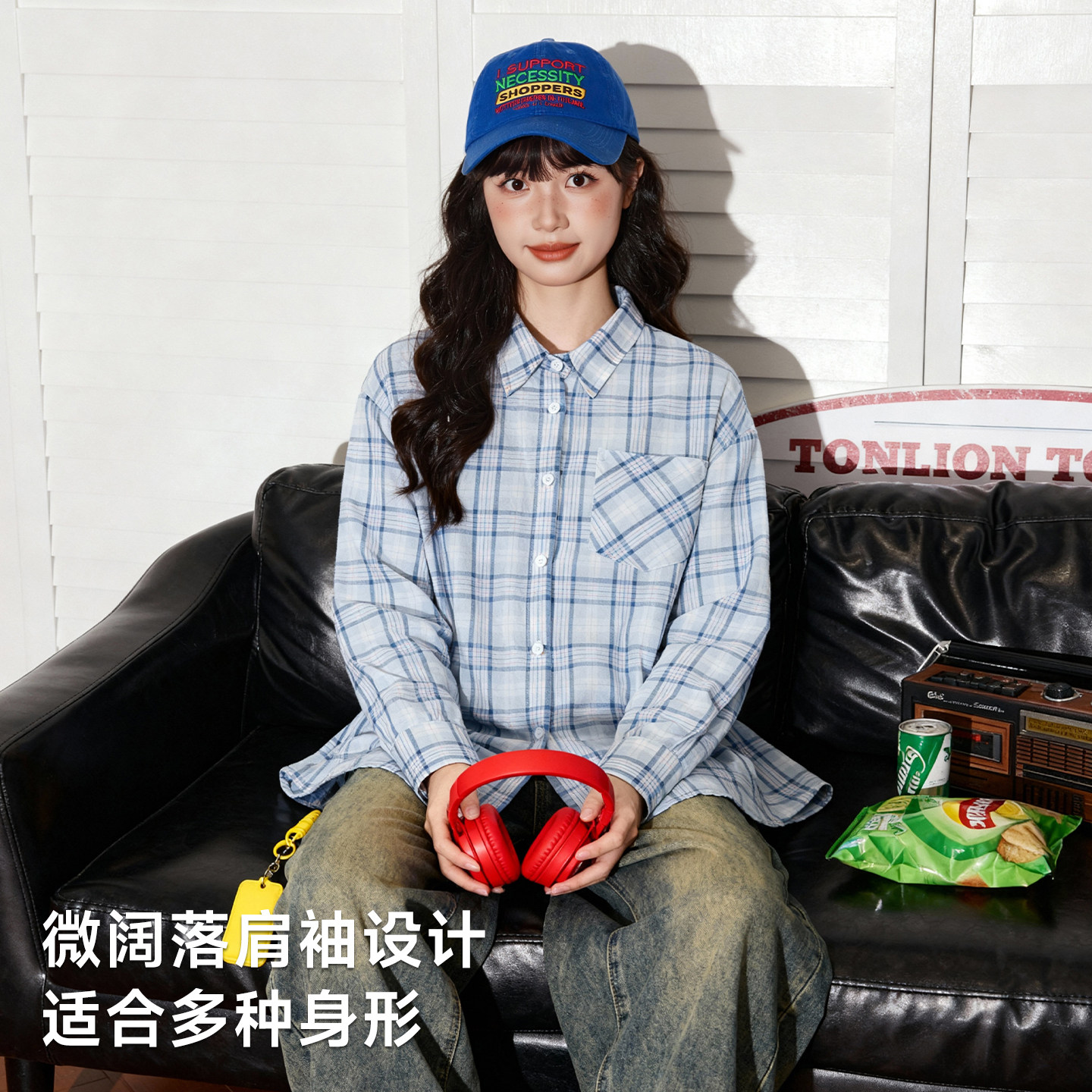 唐狮官方浅蓝色格子衬衫女2026新款春秋款宽松显瘦罩衫衬衣外套VB