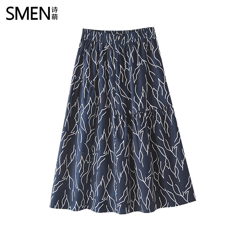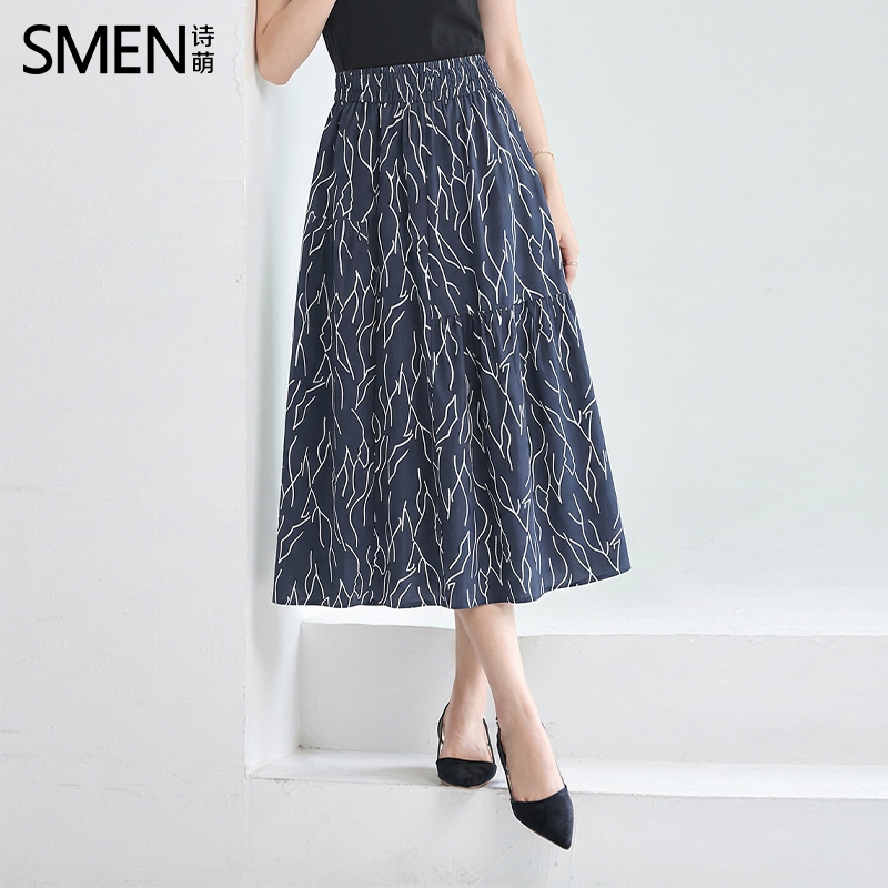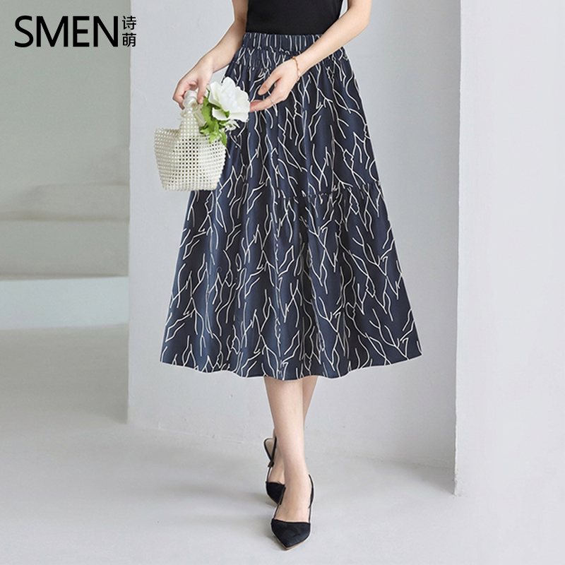 SMEN诗萌优雅印花半身裙女2026高腰A字中长款显瘦大摆裙气质半裙