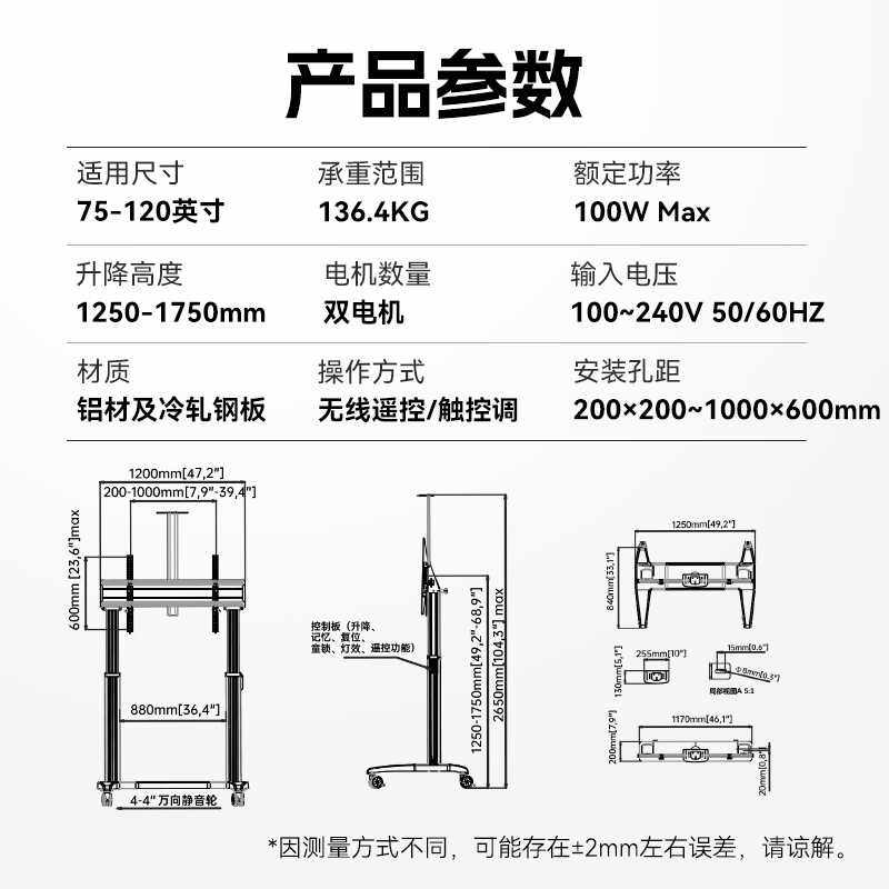 NB T70/T100遥控电动升降电视支架触摸一体机视频会议推车75-120