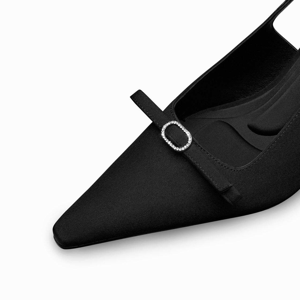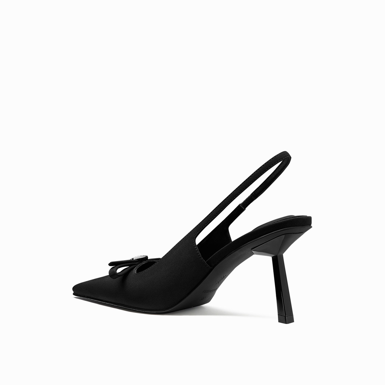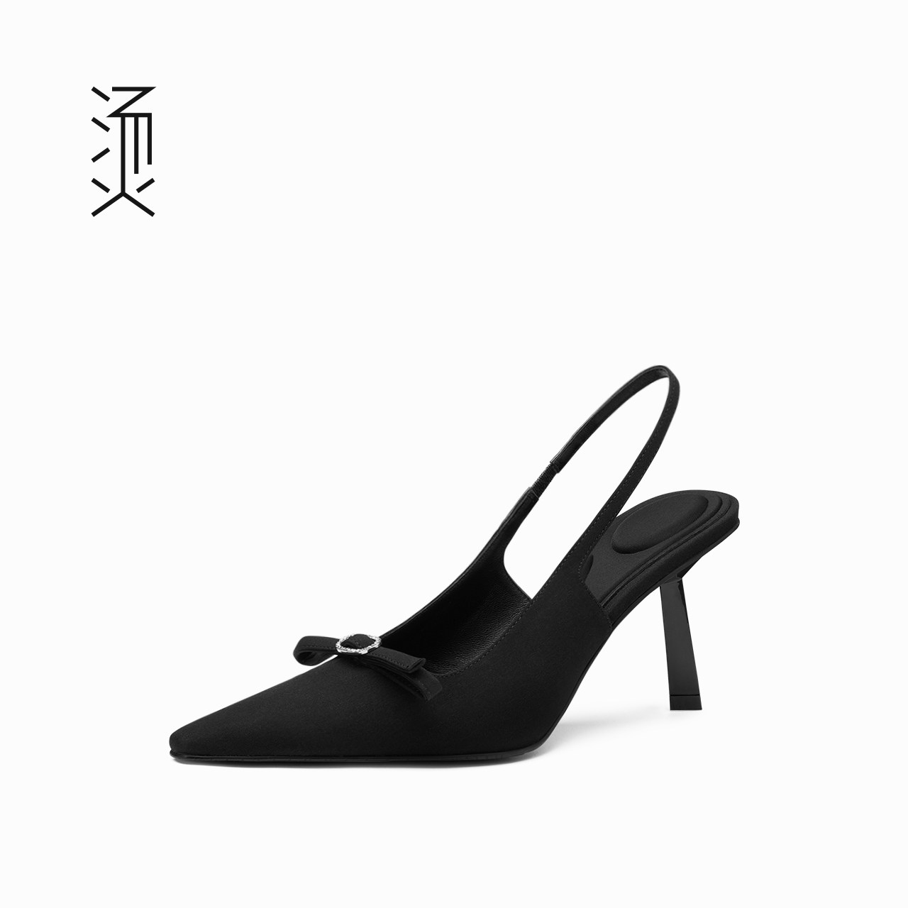 烫社交女鞋黑色布面尖头浅口细高跟一字带后空凉鞋春夏流行女单鞋