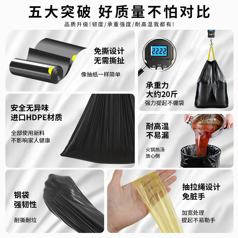 垃圾袋家用加厚手提式免撕式抽绳特厚厨房用黑色大号实惠装塑料袋