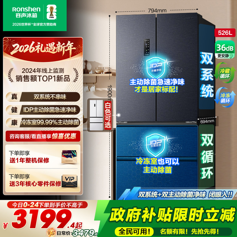 容声526L双净双系统法式多门一级能效变频家用冰箱以旧换新补贴