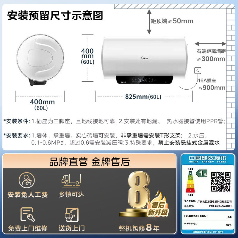 美的电热水器JE4pro省电家用洗澡卫生间一级能效50升官方60升