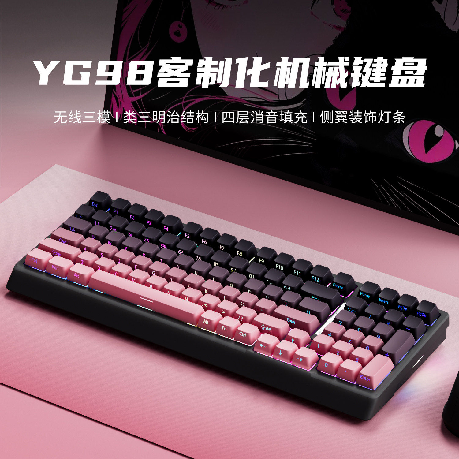 YG98黑莓侧刻无线机械键盘黑吉蛇98键套件麻将音键盘游戏电竞专用