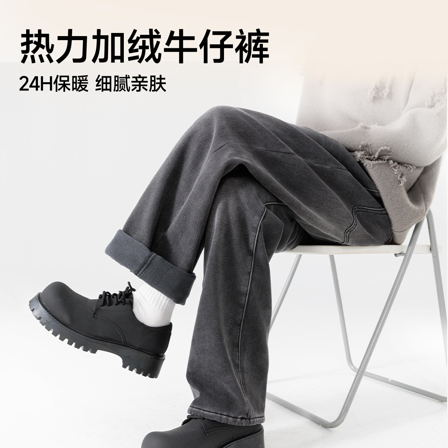 猫人复古宽松加绒加厚牛仔裤男2025冬季保暖男士直筒做旧阔腿裤Y