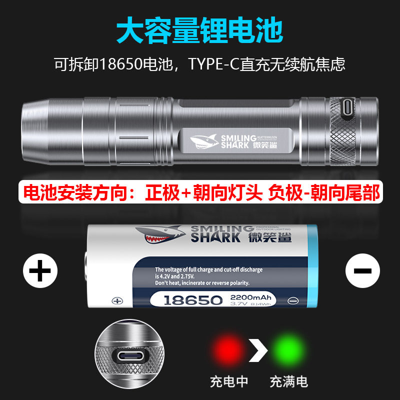 微笑鲨手电筒强光小型便携超亮长续航大容量远射充电式家用户外