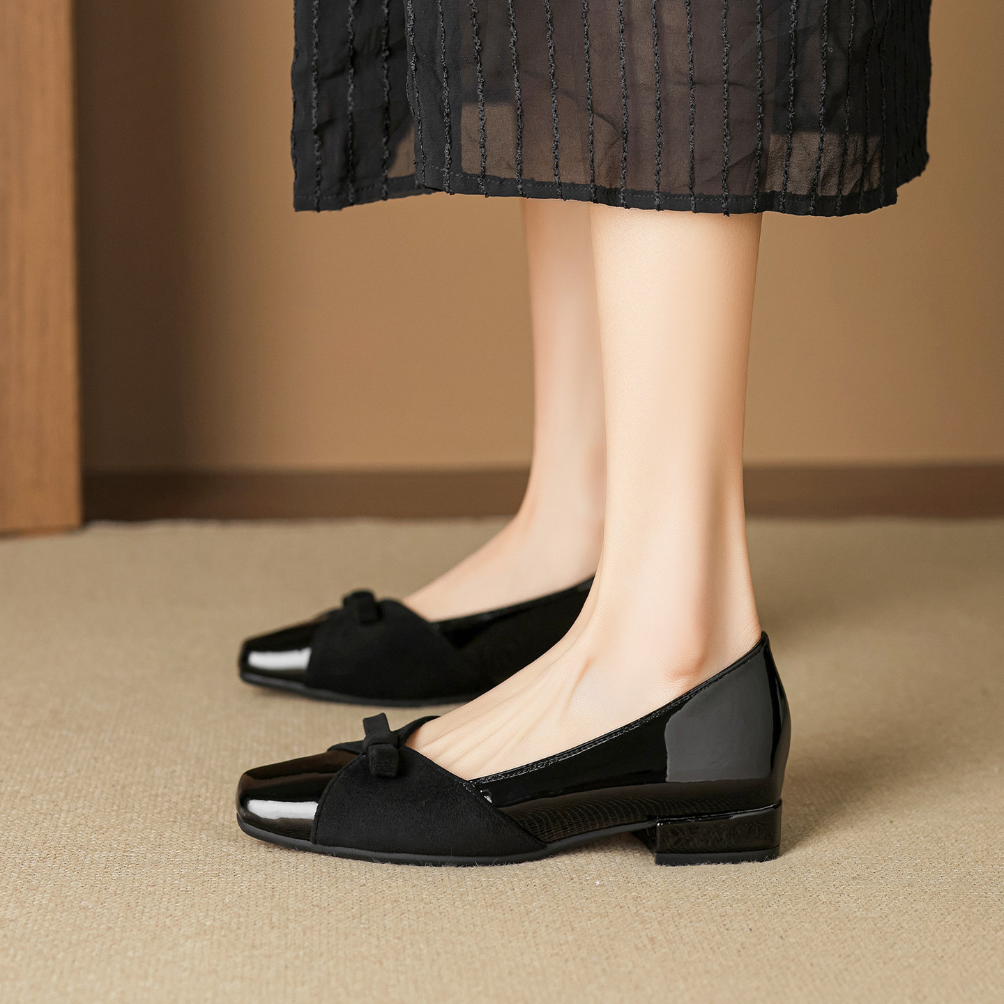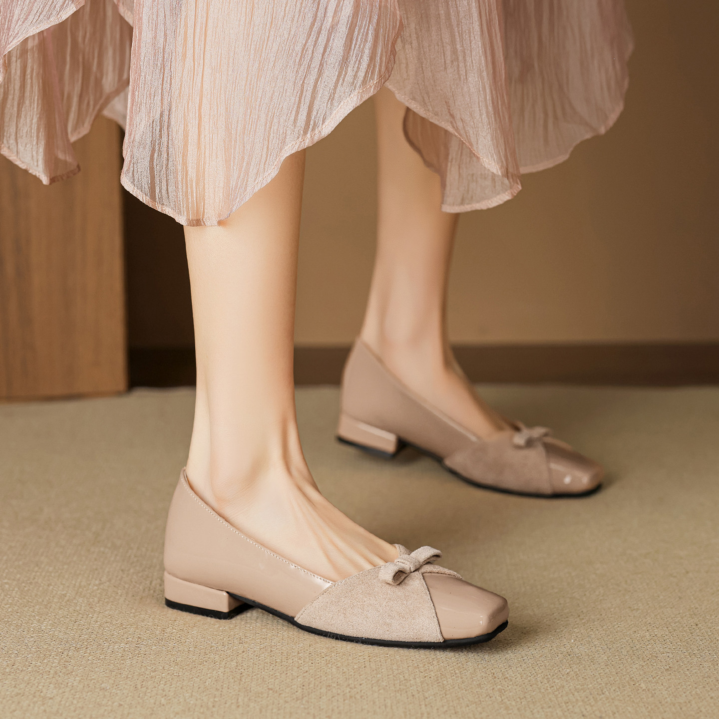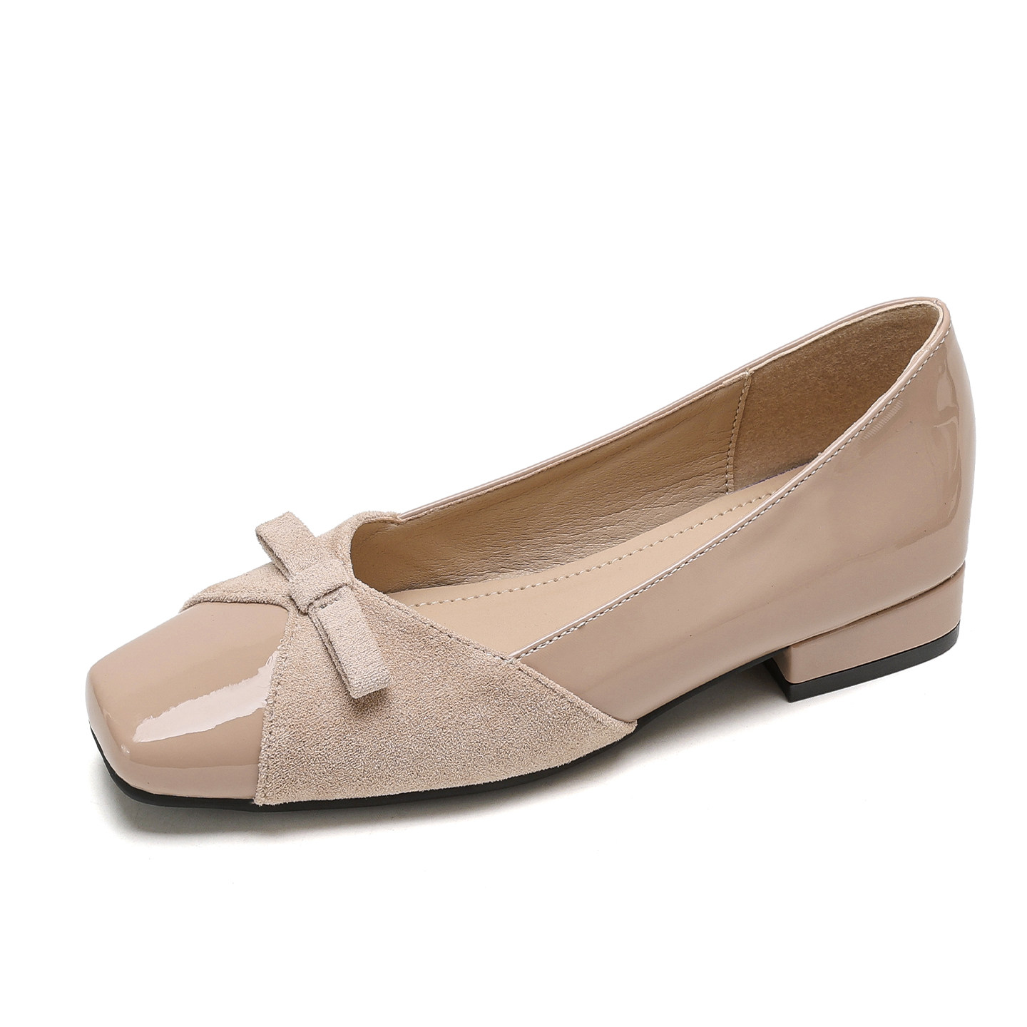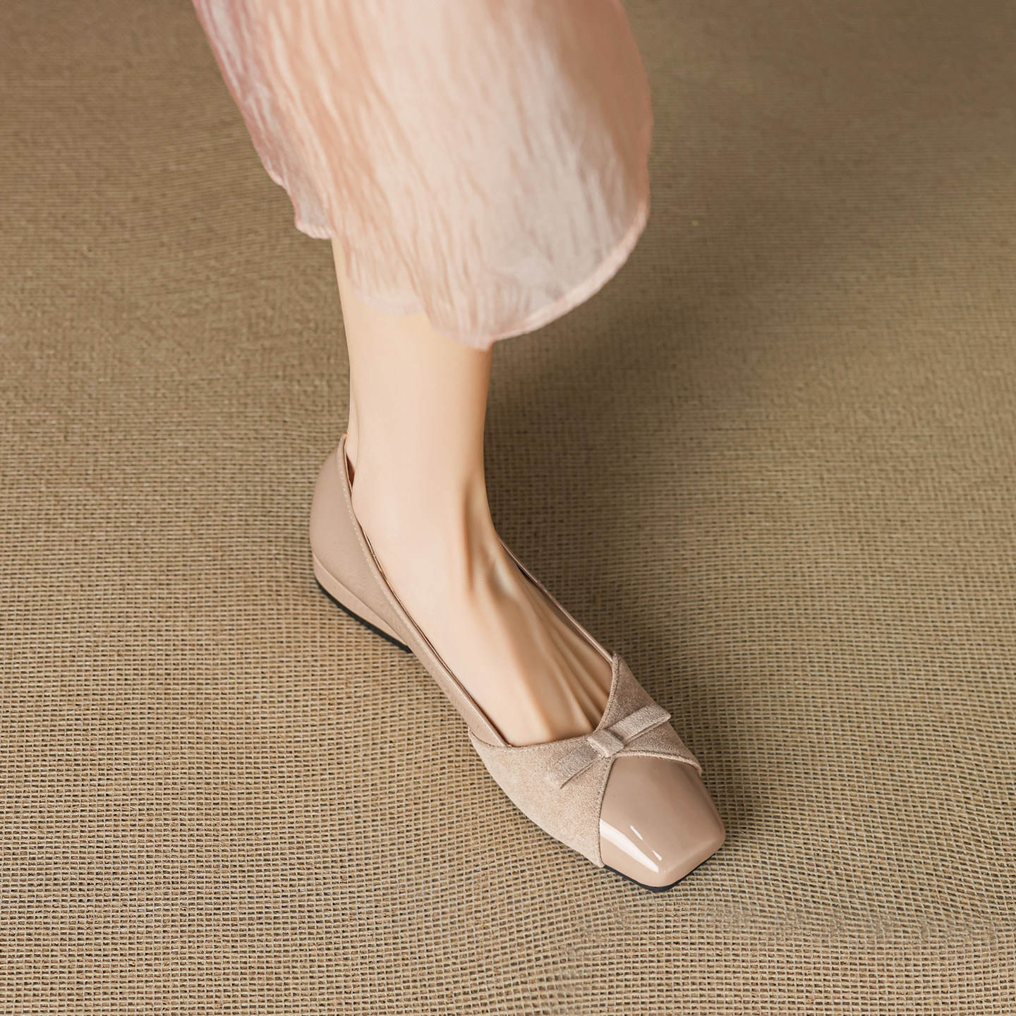 羊皮版~裸色蝴蝶结浅口单鞋女法式配裙子低跟绝美晚晚鞋大码女鞋