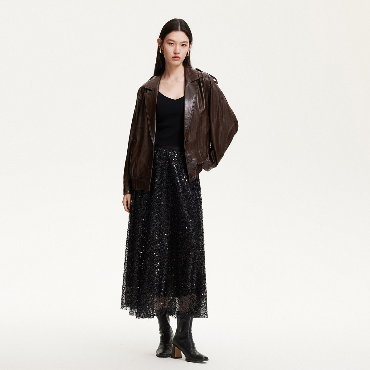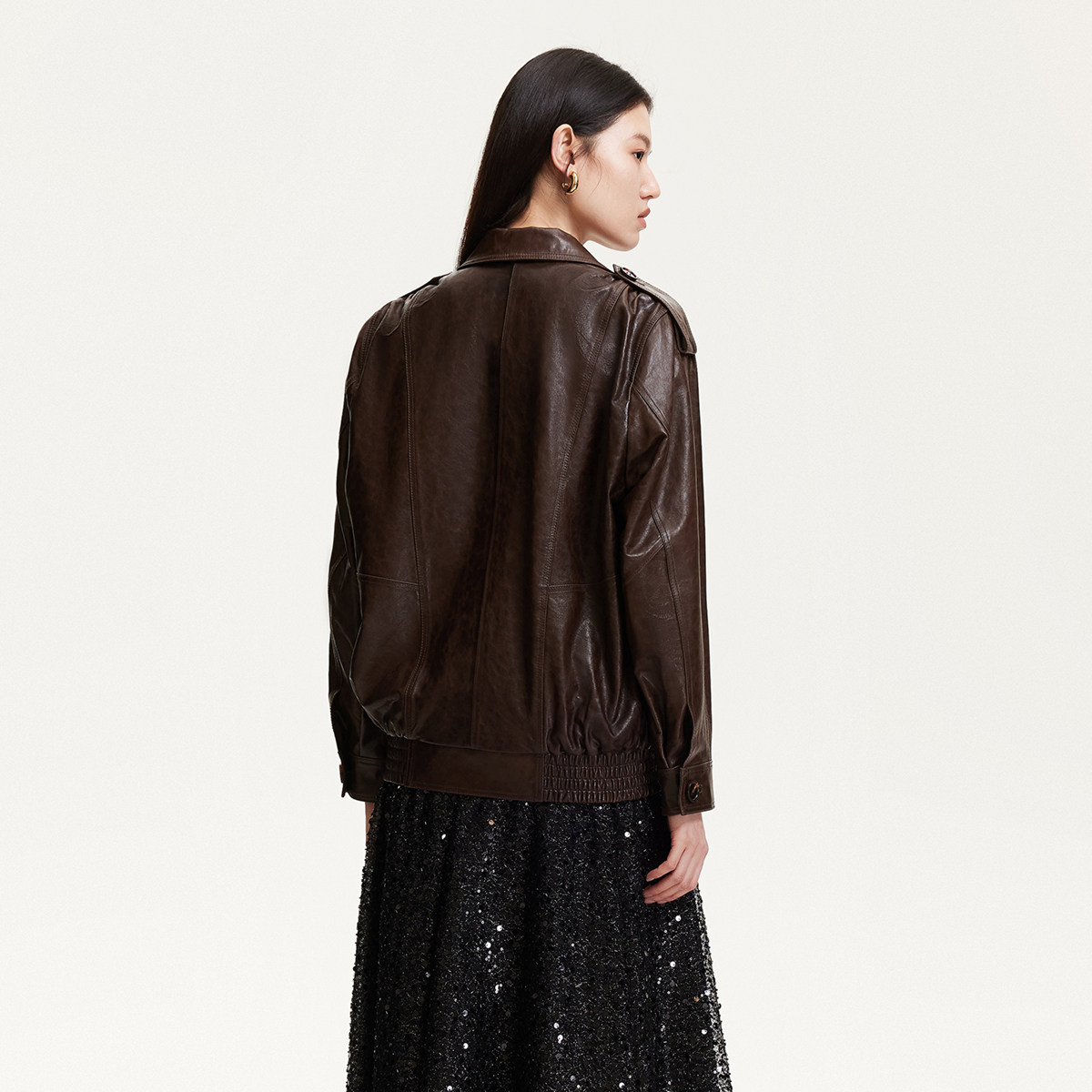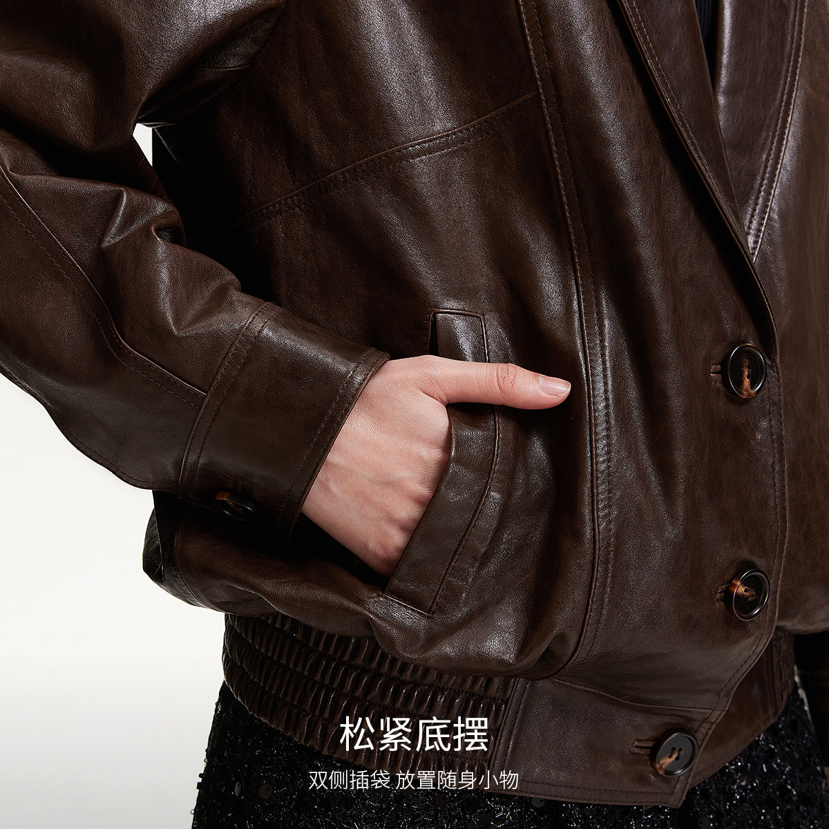 Vero Moda皮衣2025春季新款松紧底摆肩章设计羊皮皮衣325110012