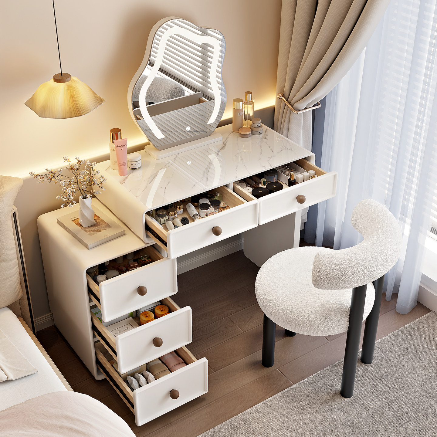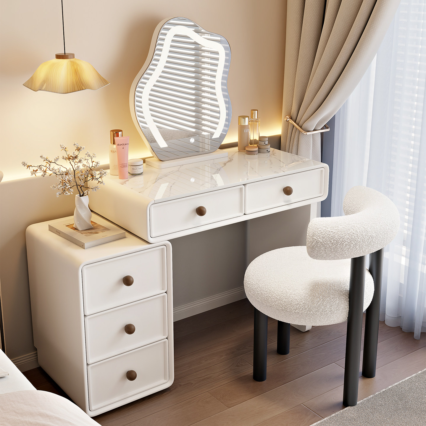 中古奶油风化妆桌卧室简约法式梳妆台小户型化妆台斗柜一体焕新补