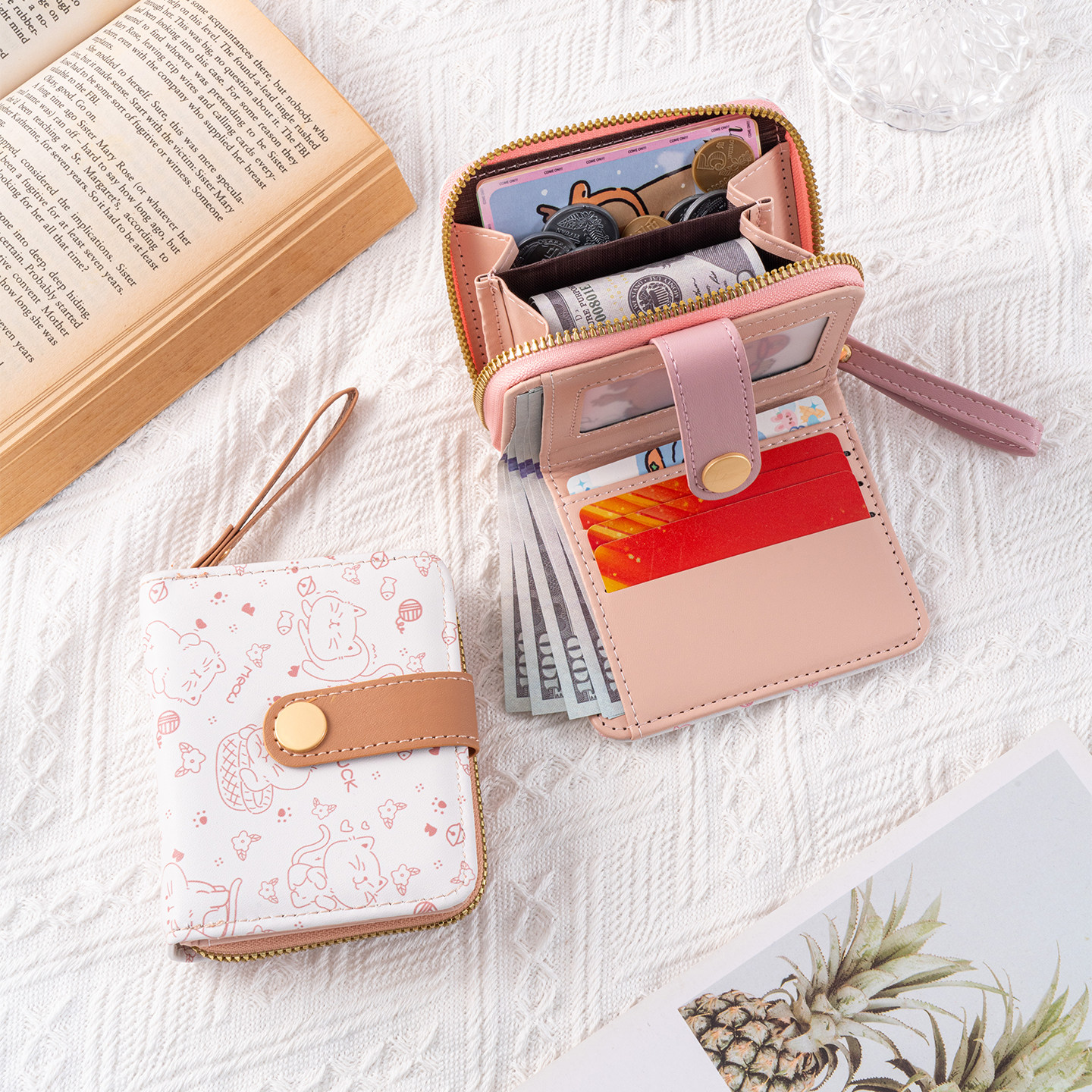 稻草人钱包女韩版学生小清新可爱零钱包小众简约钱夹小巧真皮卡包