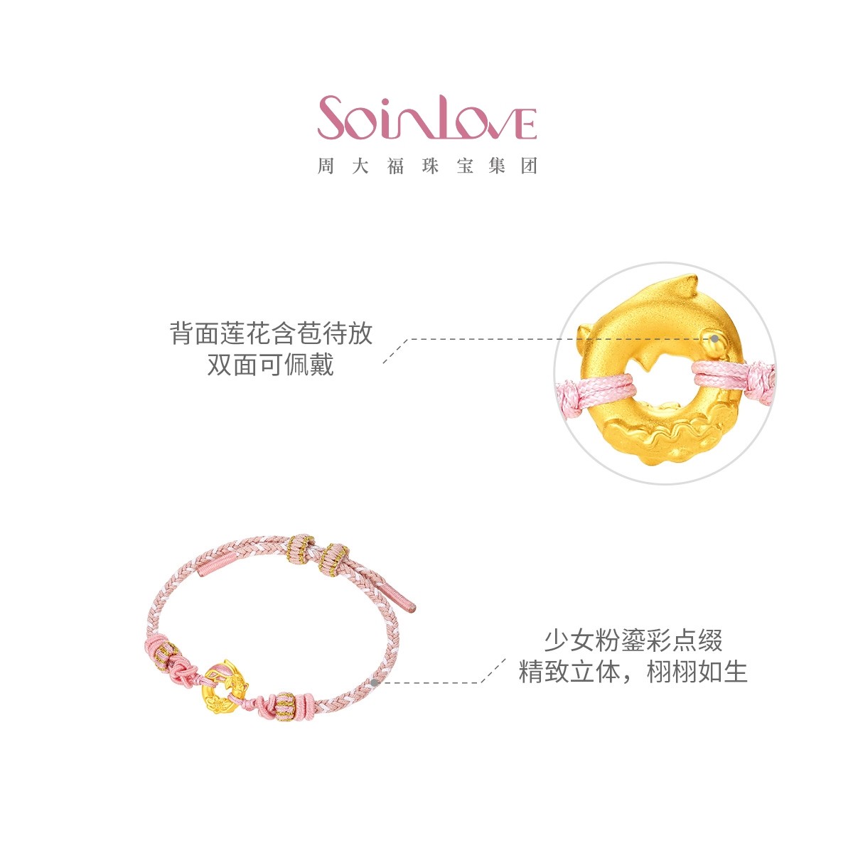 周大福SOINLOVE蜜粉金十里红妆锦鲤莲花平安扣手链手绳生日礼物