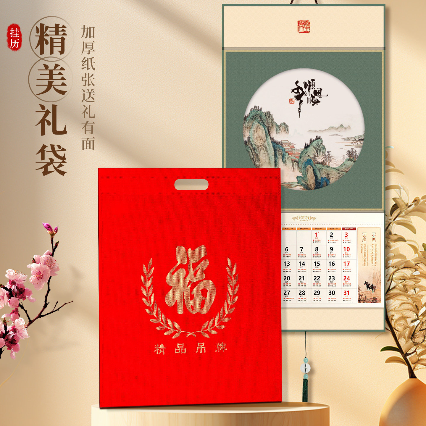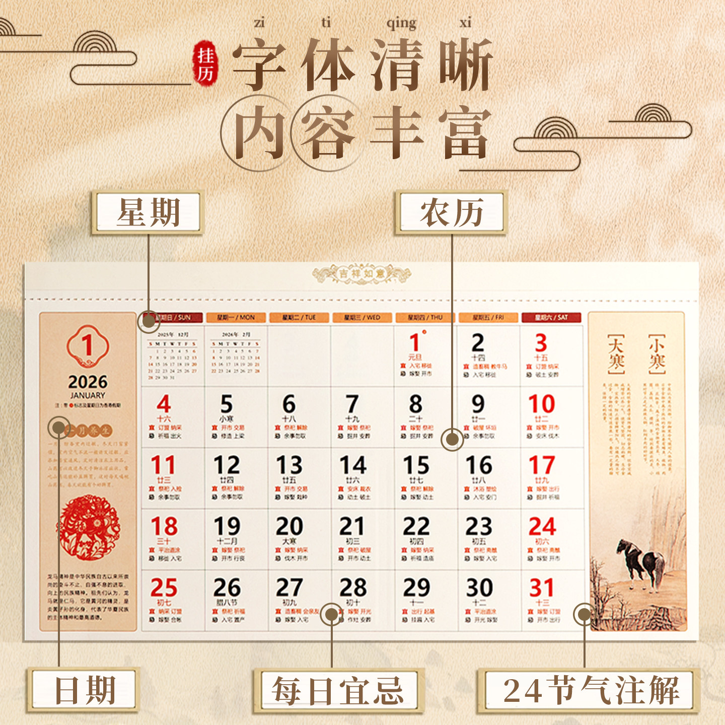 挂历2026年柿柿如意艺术壁画企业创意广告定制吊牌福牌马年家用大号挂墙福字日历高档中国风月历手撕万年历