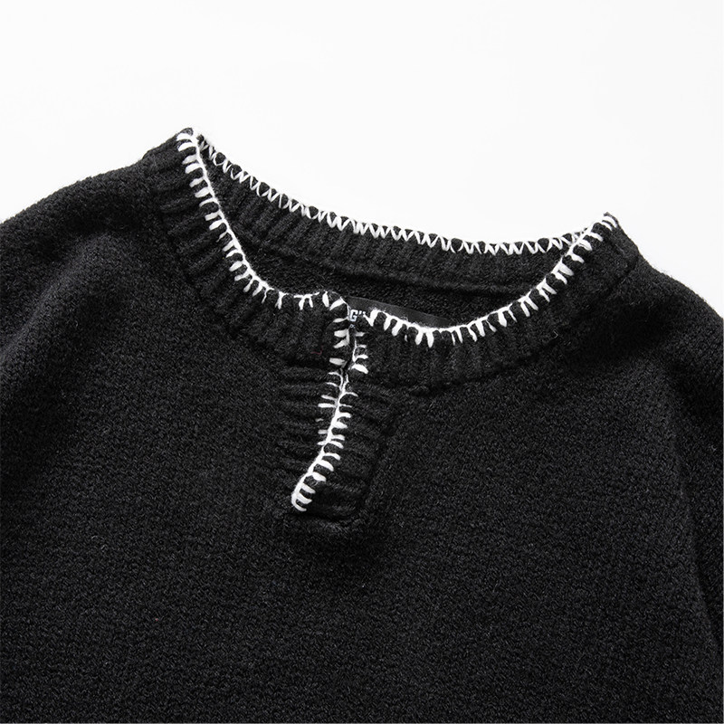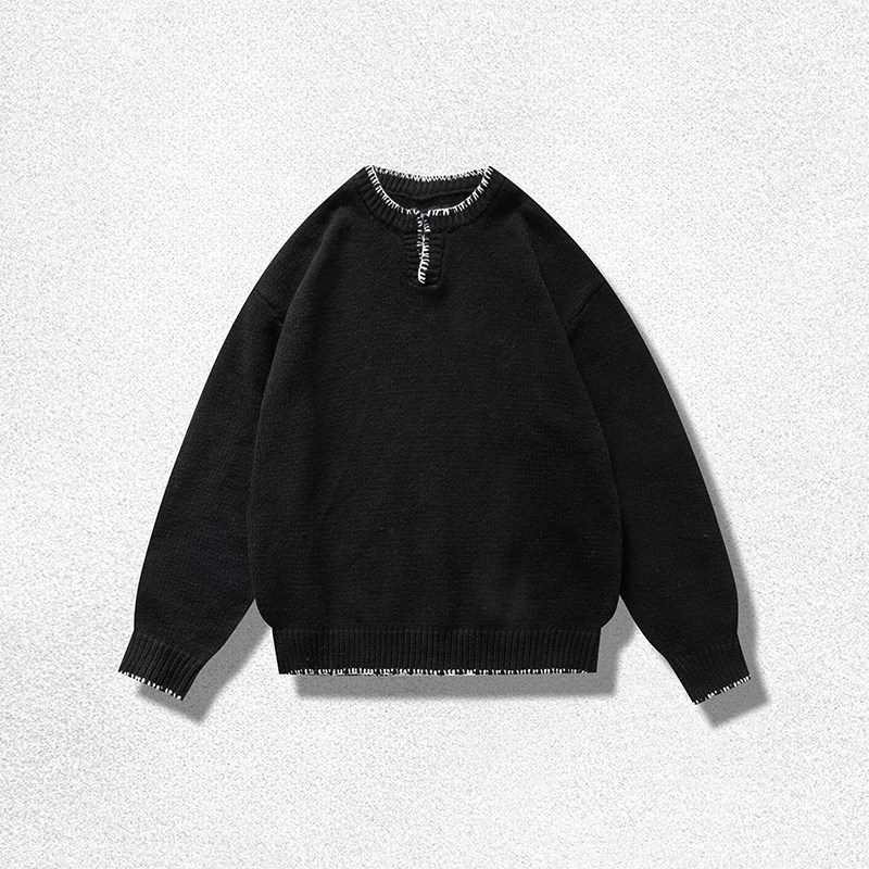 马登工装美式复古竖条纹亨利领毛衣宽松加厚黑色打底针织衫男秋冬