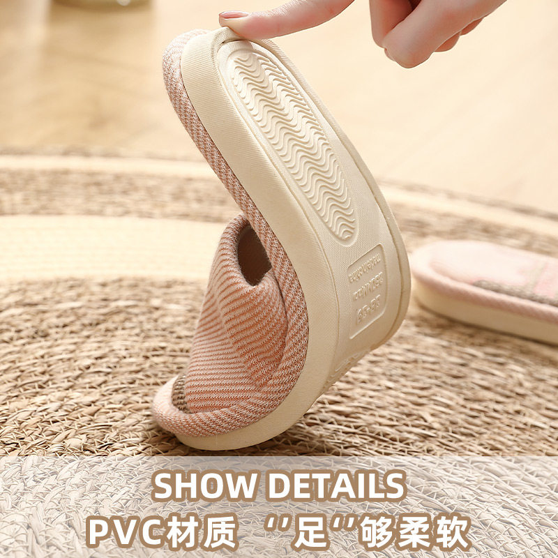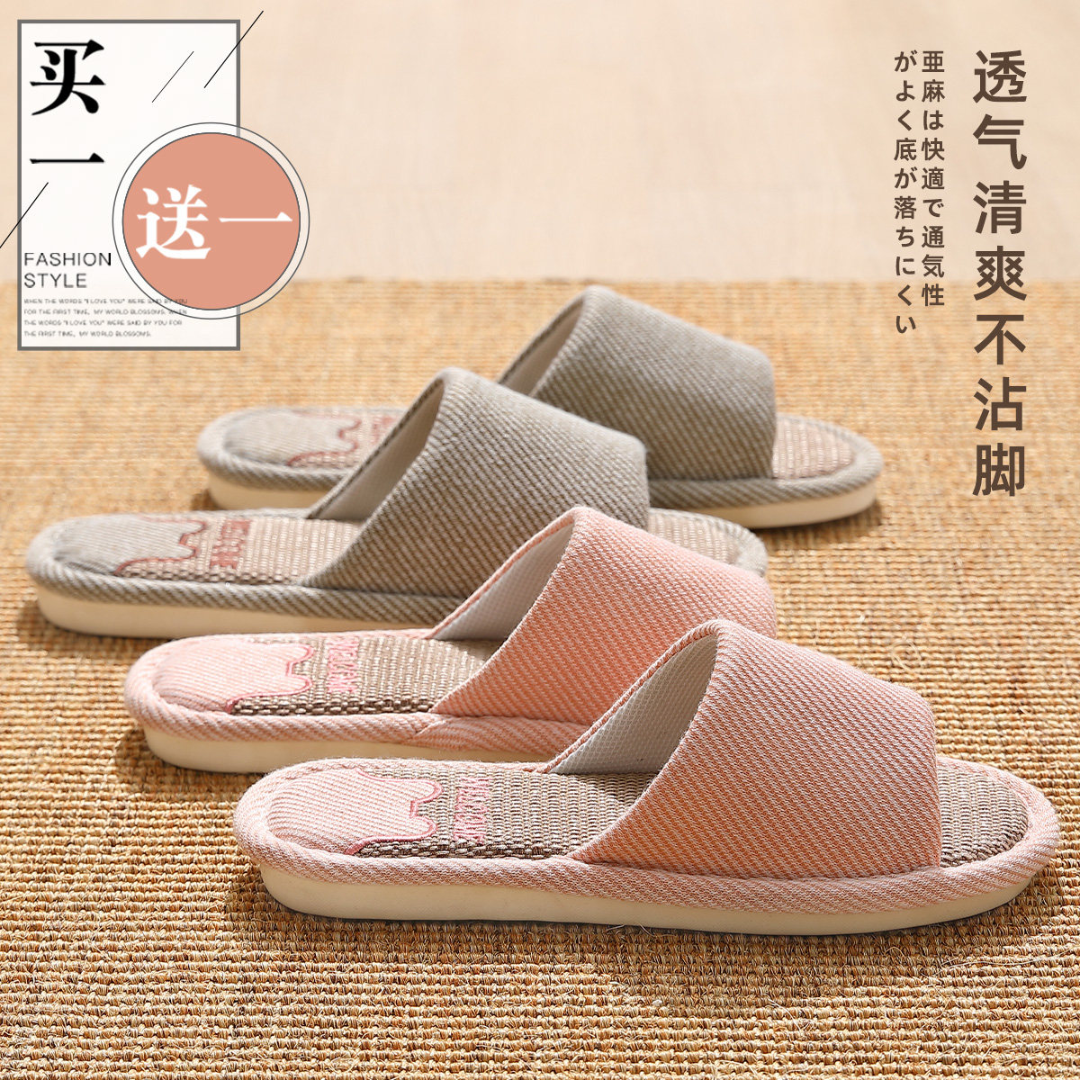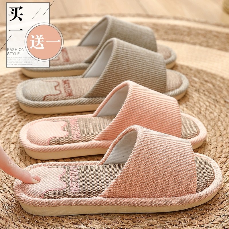 买1送1亚麻拖鞋女士情侣家居一对静音防滑家用招待客人棉麻拖鞋男