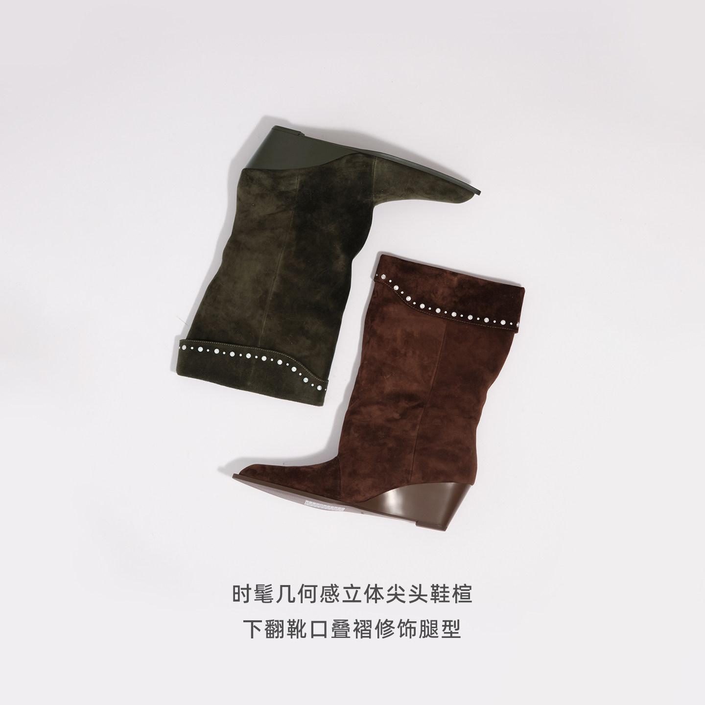 尖头坡跟堆堆靴 波西米亚烫钻复古羊反绒