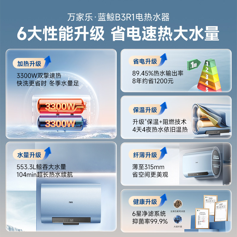 政府补贴万家乐电热水器扁桶双胆家用卫生间洗澡储水速热60升B3R1