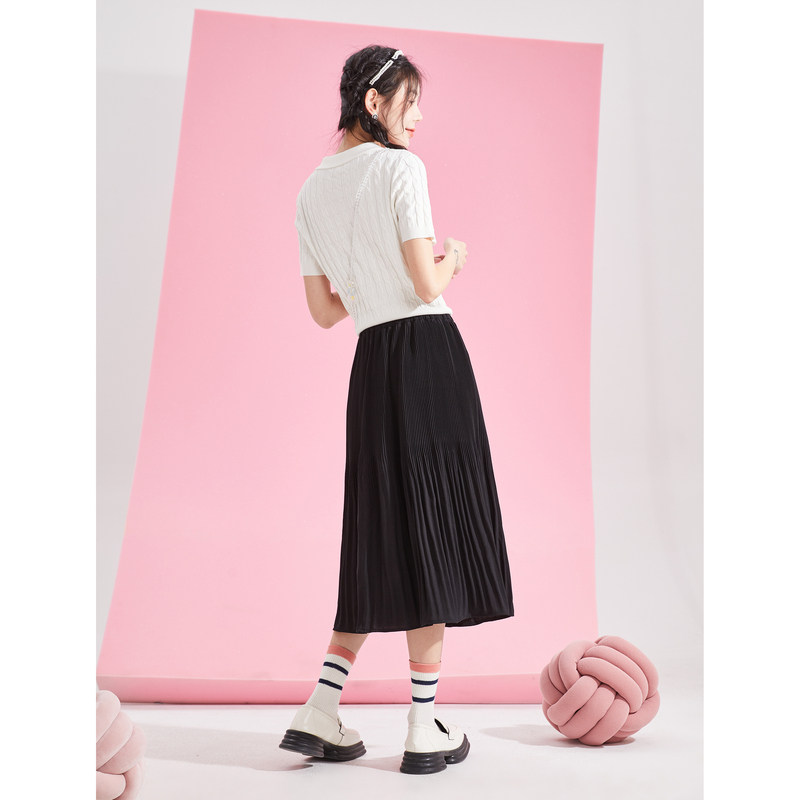 她池松紧腰百褶裙2025秋装新款女装时尚简约中长款A字高腰半身裙