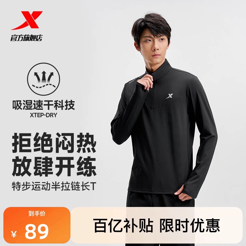 特步长袖T恤男士官方秋季新款户外半拉链防晒上衣徒步运动速干衣