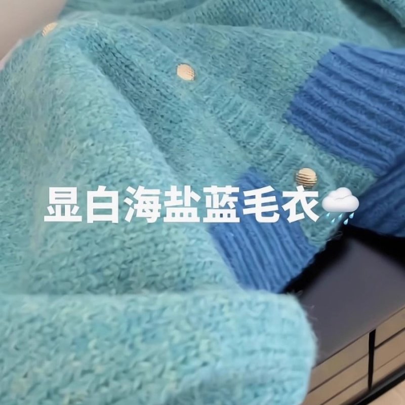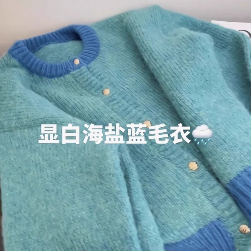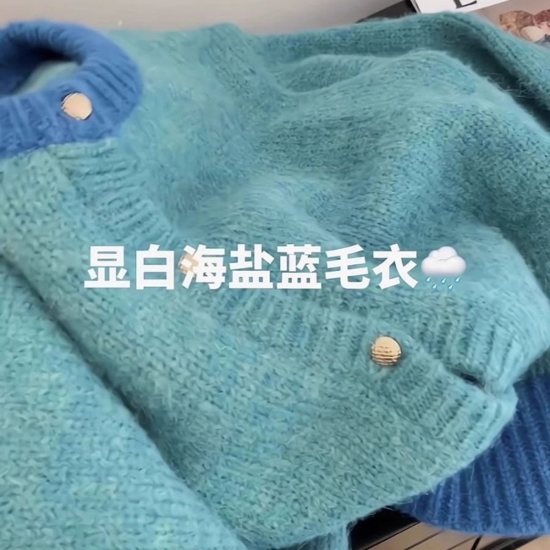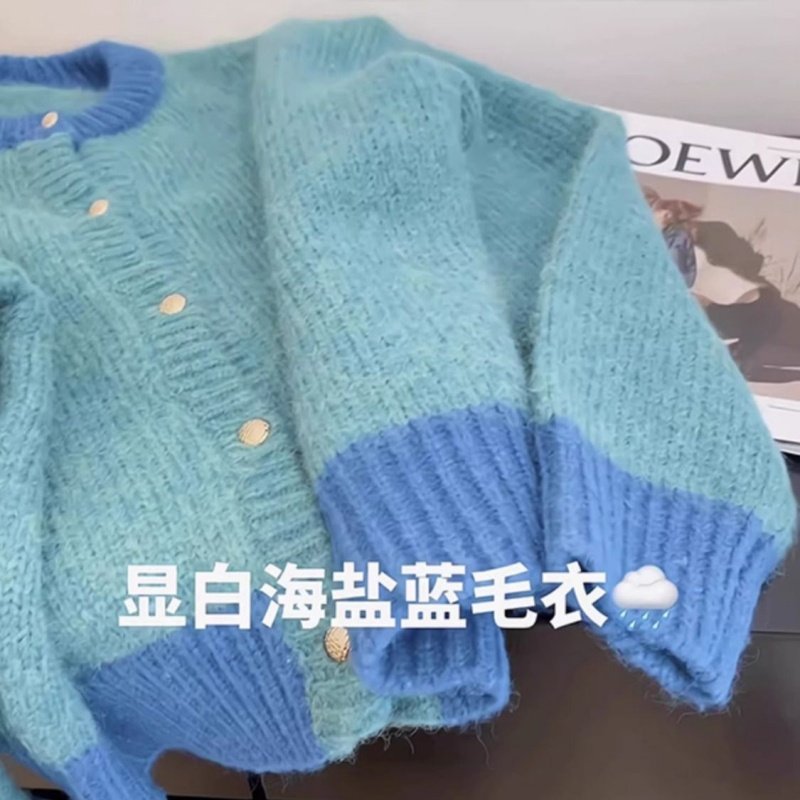 蓝色圆领针织开衫毛衣女秋季马海毛软糯大码内搭长袖上衣秋