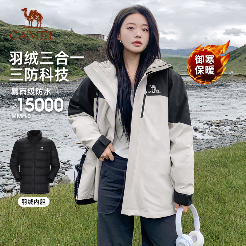 骆驼三合一户外冲锋衣内胆羽绒女防水防风加厚保暖旅行外套冬季男