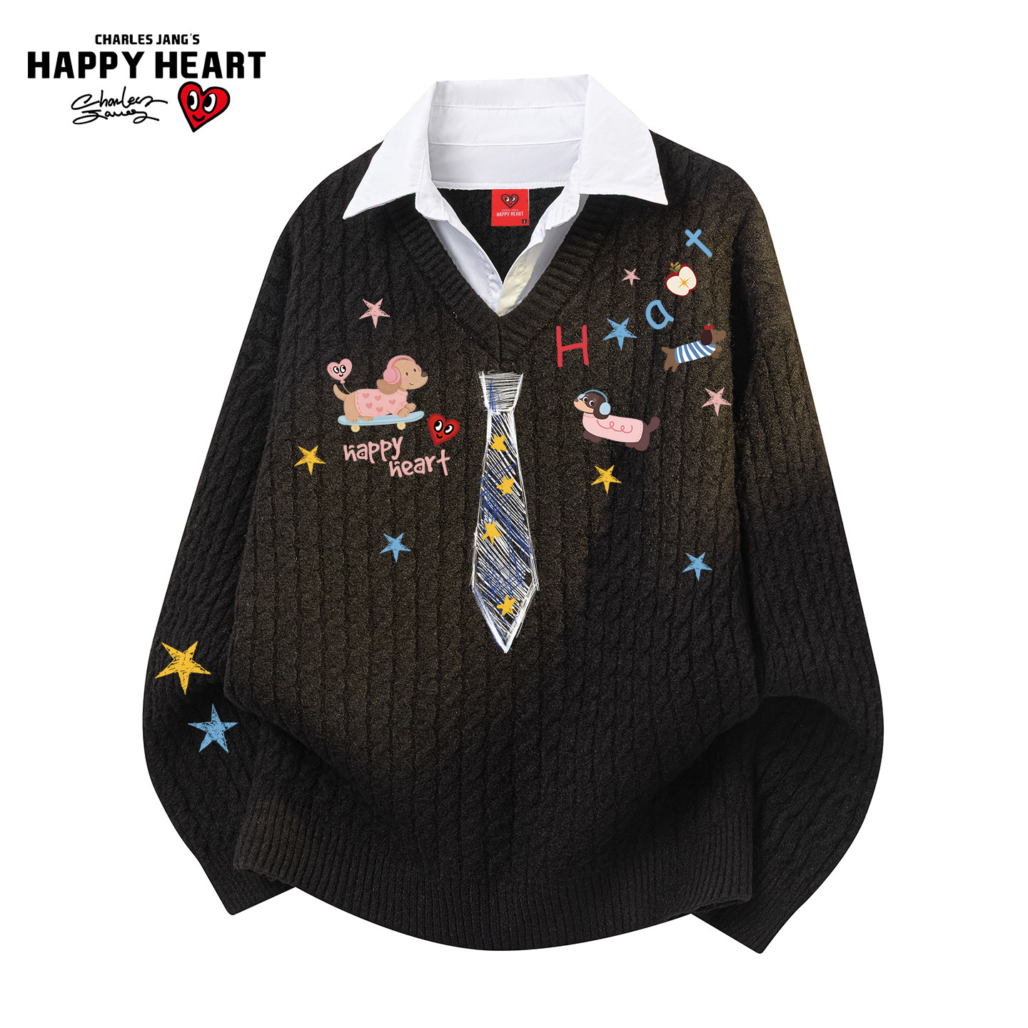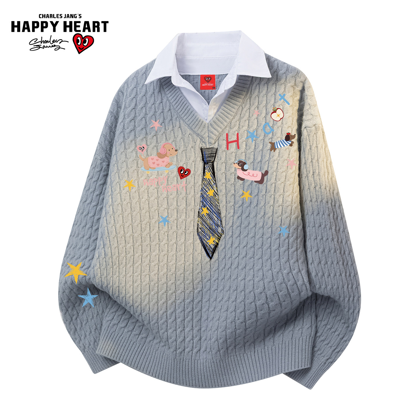 查尔斯桃心假两件腊肠狗领带印花毛衣男女潮牌新款百搭情侣针织衫