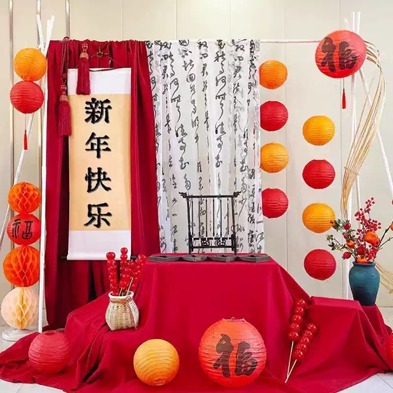 新中式国风纱幔印花网纱布料幼儿园环创diy装饰古风书法绿色布幔