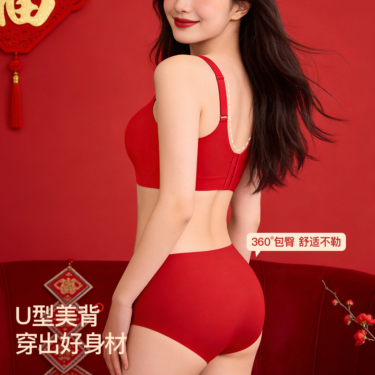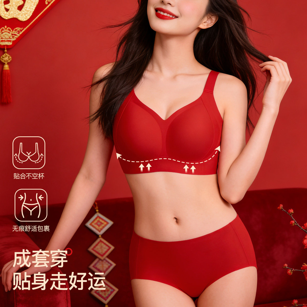 润微大胸本命年内衣套装女提拉上托大码无痕收副乳无痕文胸罩马年
